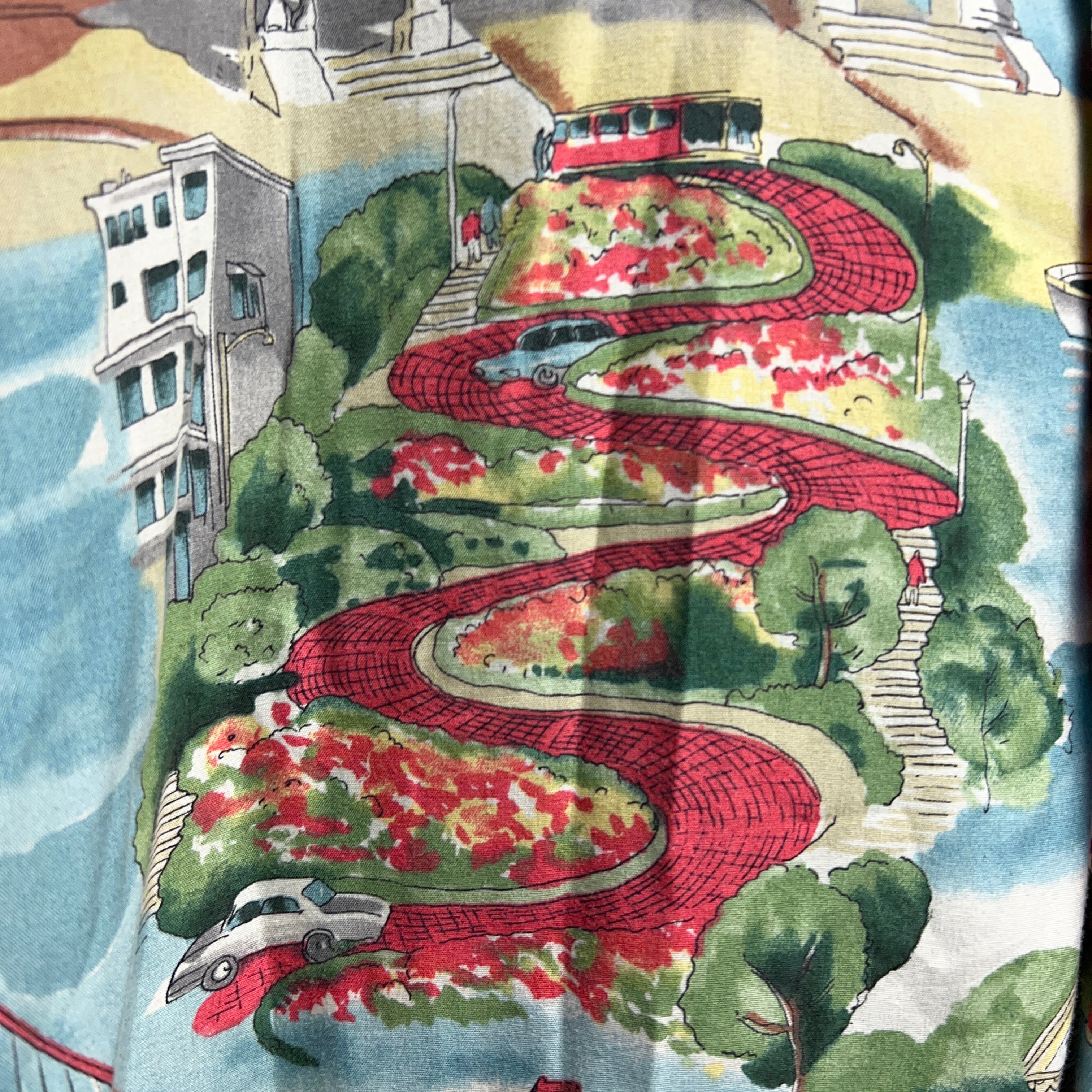 カリフォルニア州サンフランシスコの街並みが描かれたお洒落な総柄シャツ。