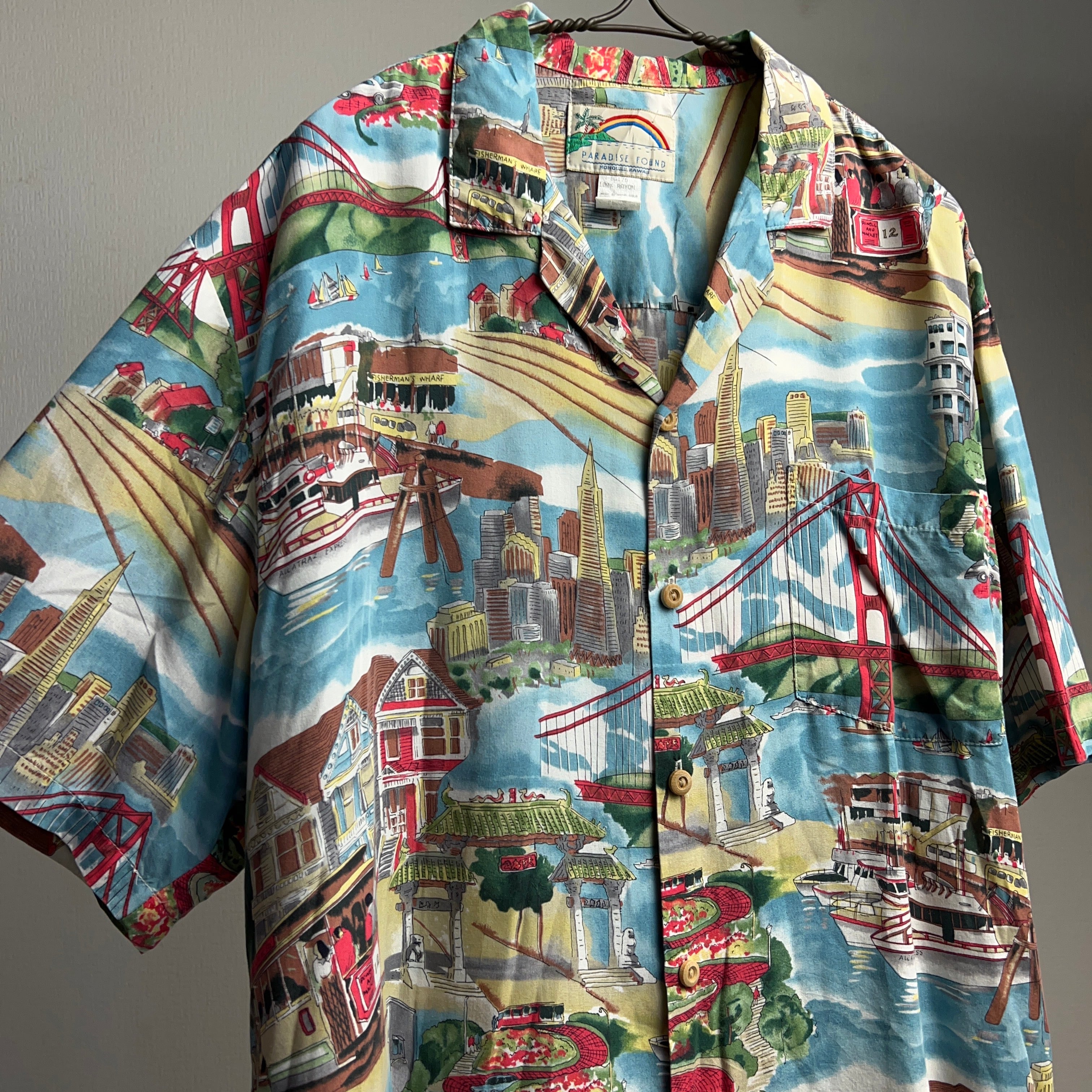 90's "SAN FRANCISCO" Landscape Pattern Shirt 90年代 総柄シャツ 風景アート サンフランシスコ オープンカラーシャツ レーヨン【0801A38】【ネコポス発送可能】