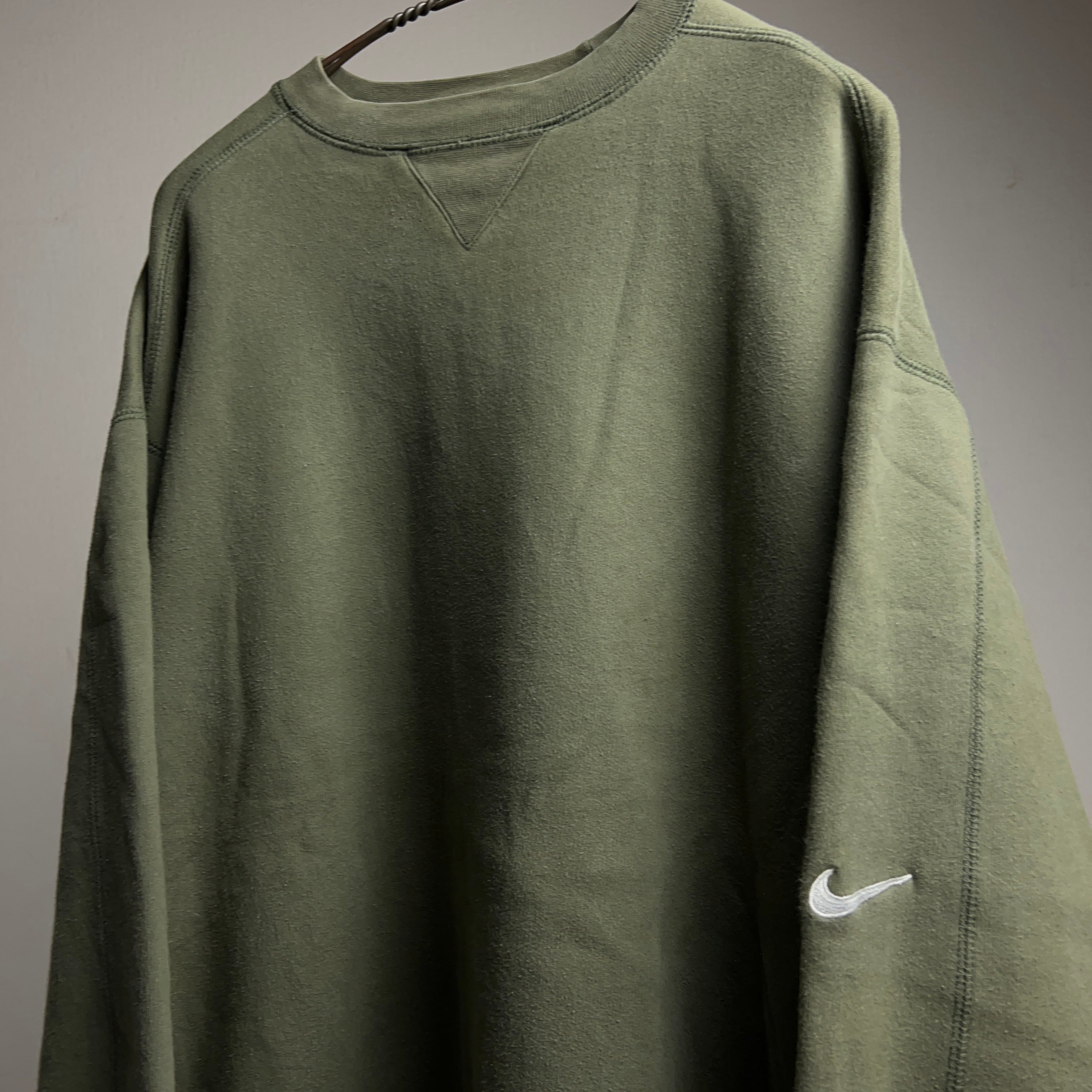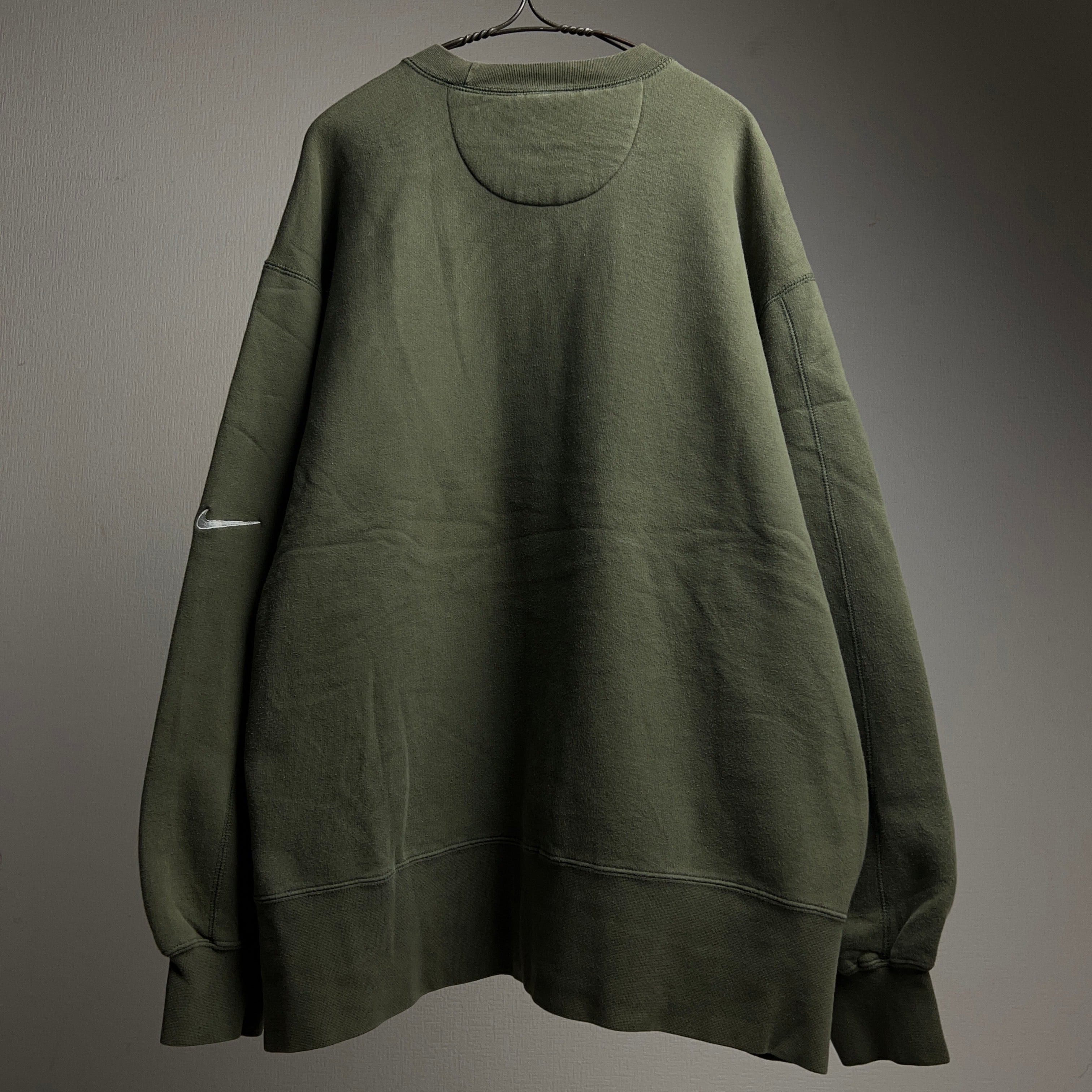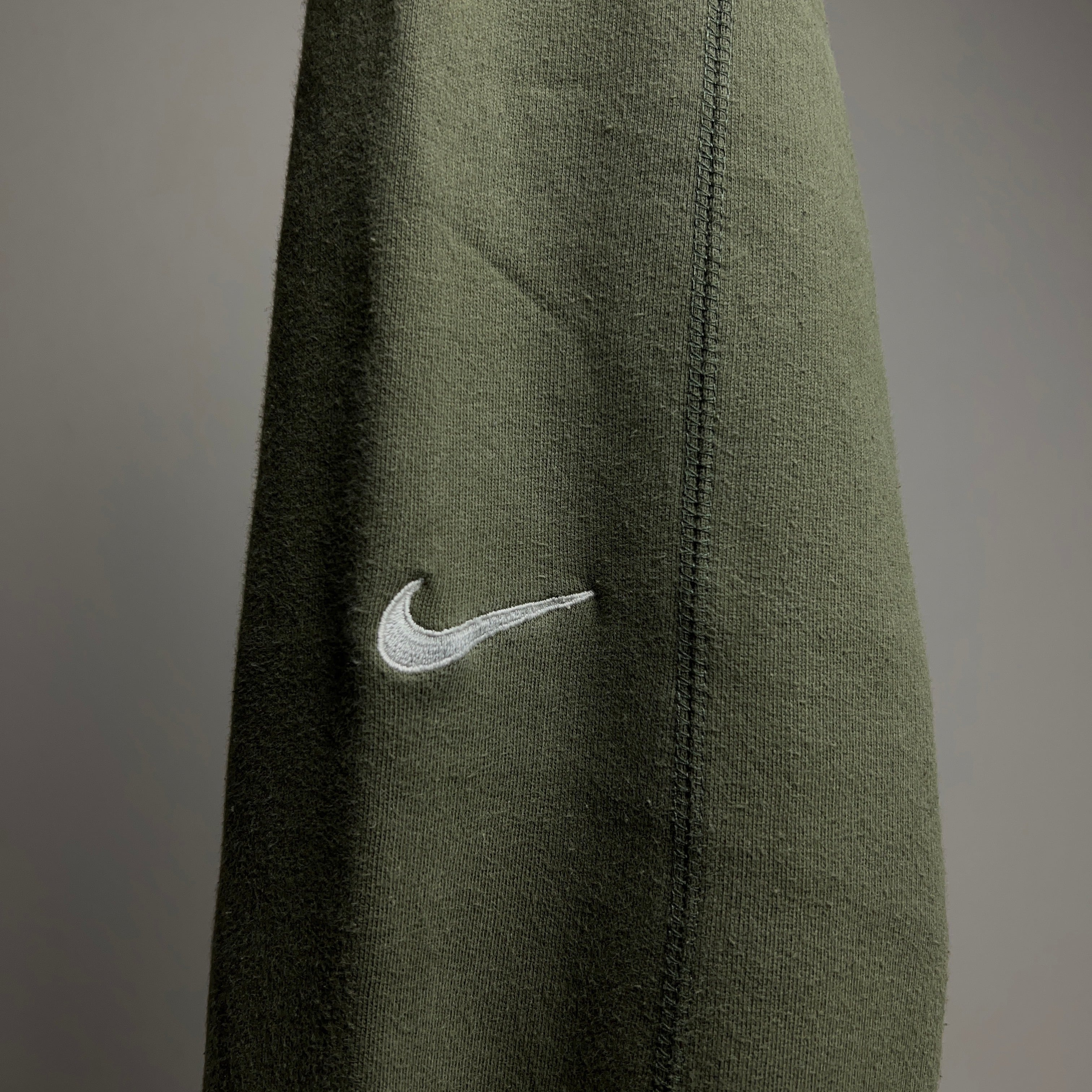 落ち着いたカーキ系のグリーンカラーで袖にスウッシュロゴの刺繍入り。