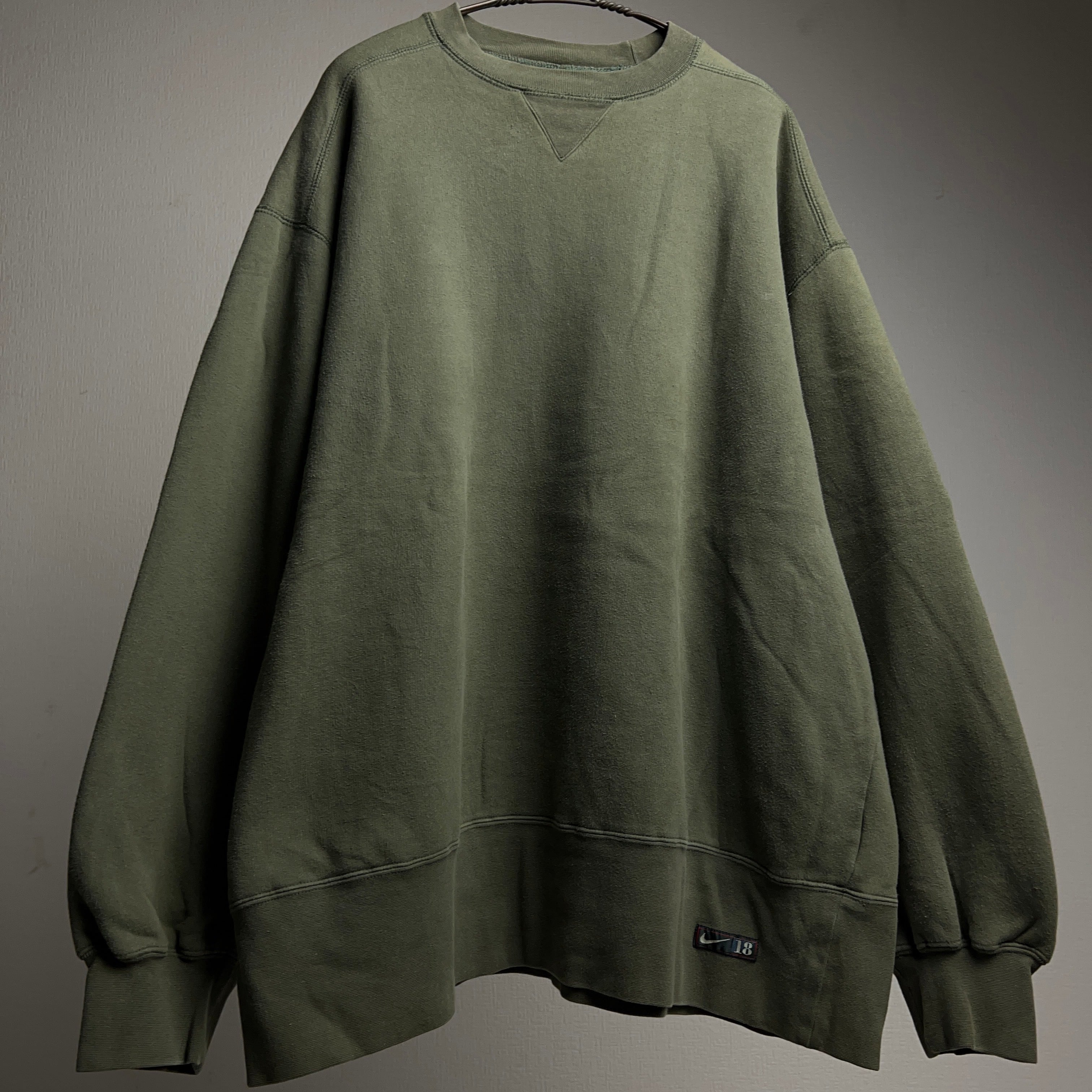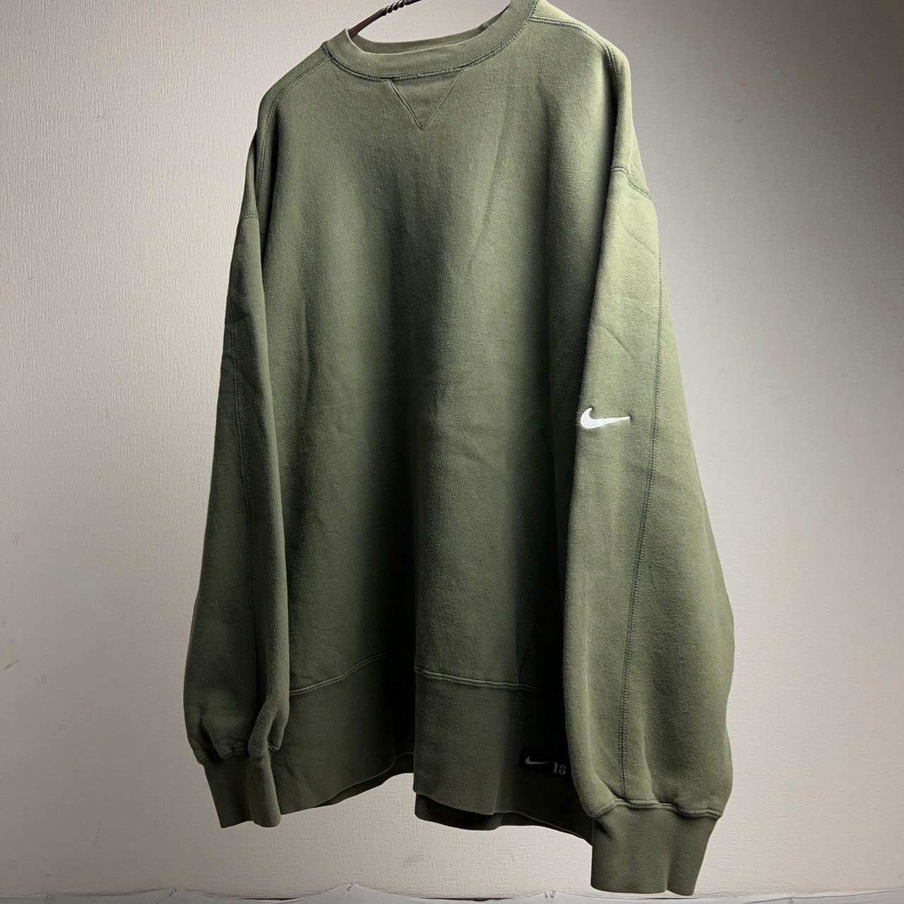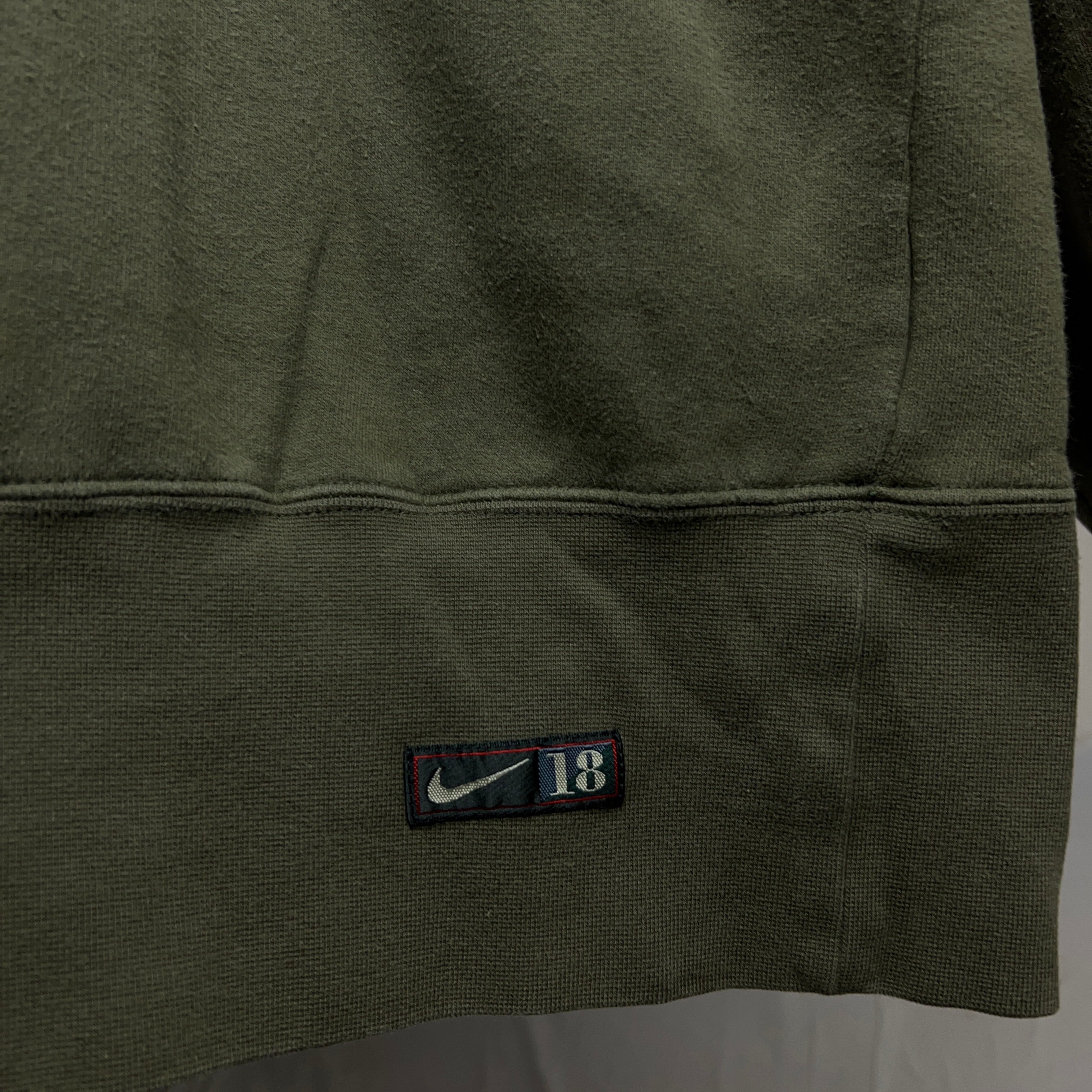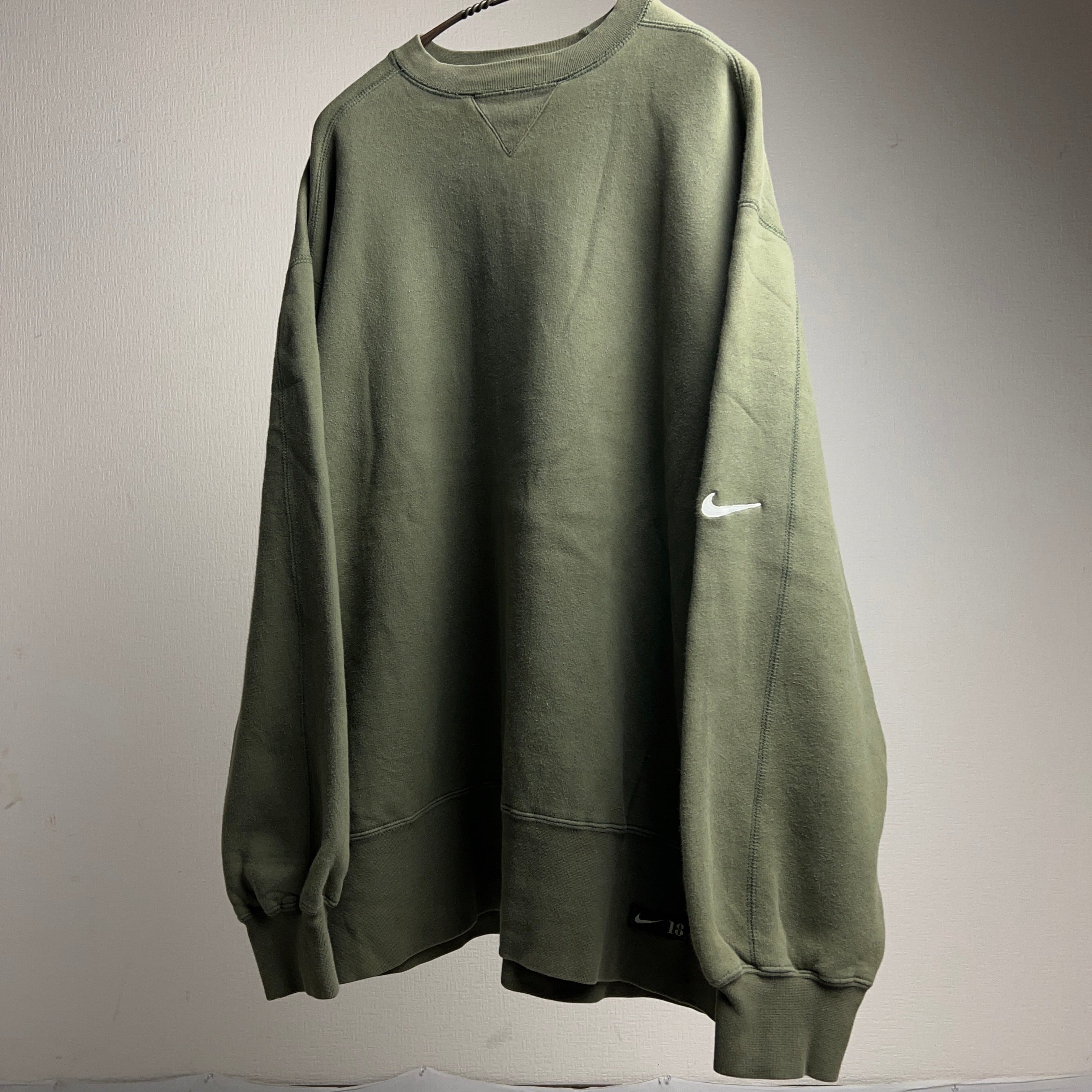 落ち着いたカーキ系のグリーンカラーで袖にスウッシュロゴの刺繍入り。