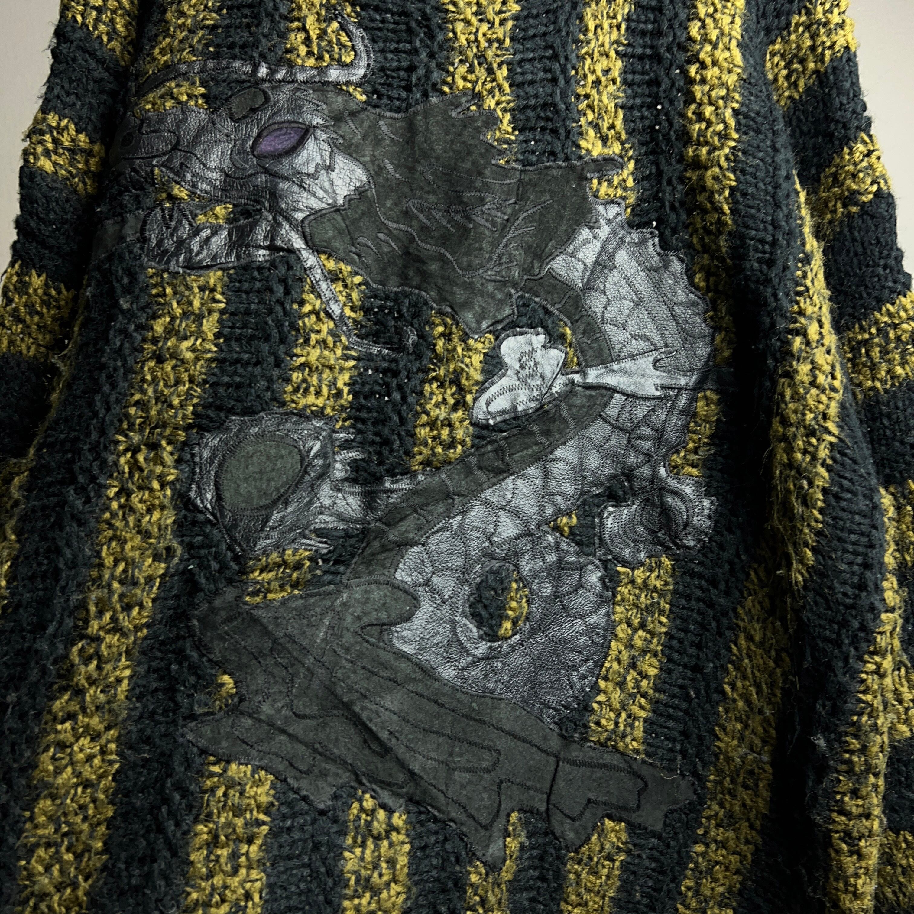 洒落た太めのストライプニットにスエード&レザーで龍を縫い合わせた前衛的なデザイン。