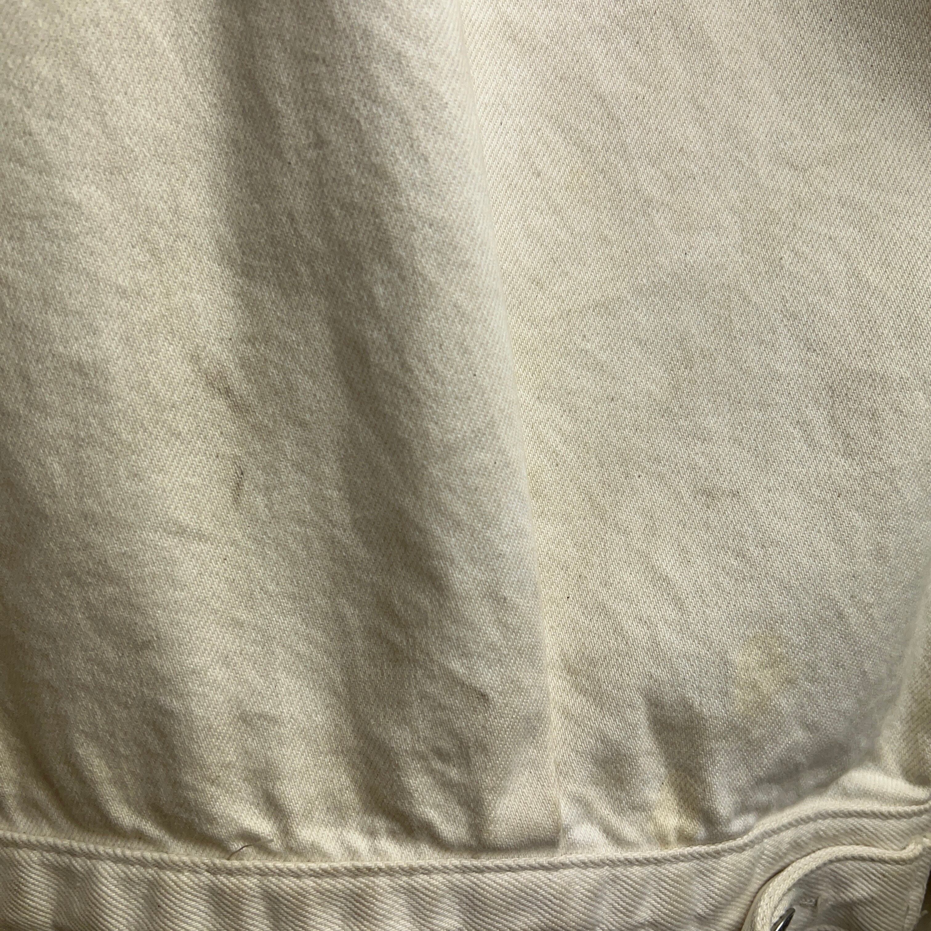 全体的に汚れがありますが、マイナス要素ではなく汚れがあることによって古いデニムに見えるというプラス要素の汚れ付き。(ピンピンのホワイトデニムであればこの雰囲気は出ません)