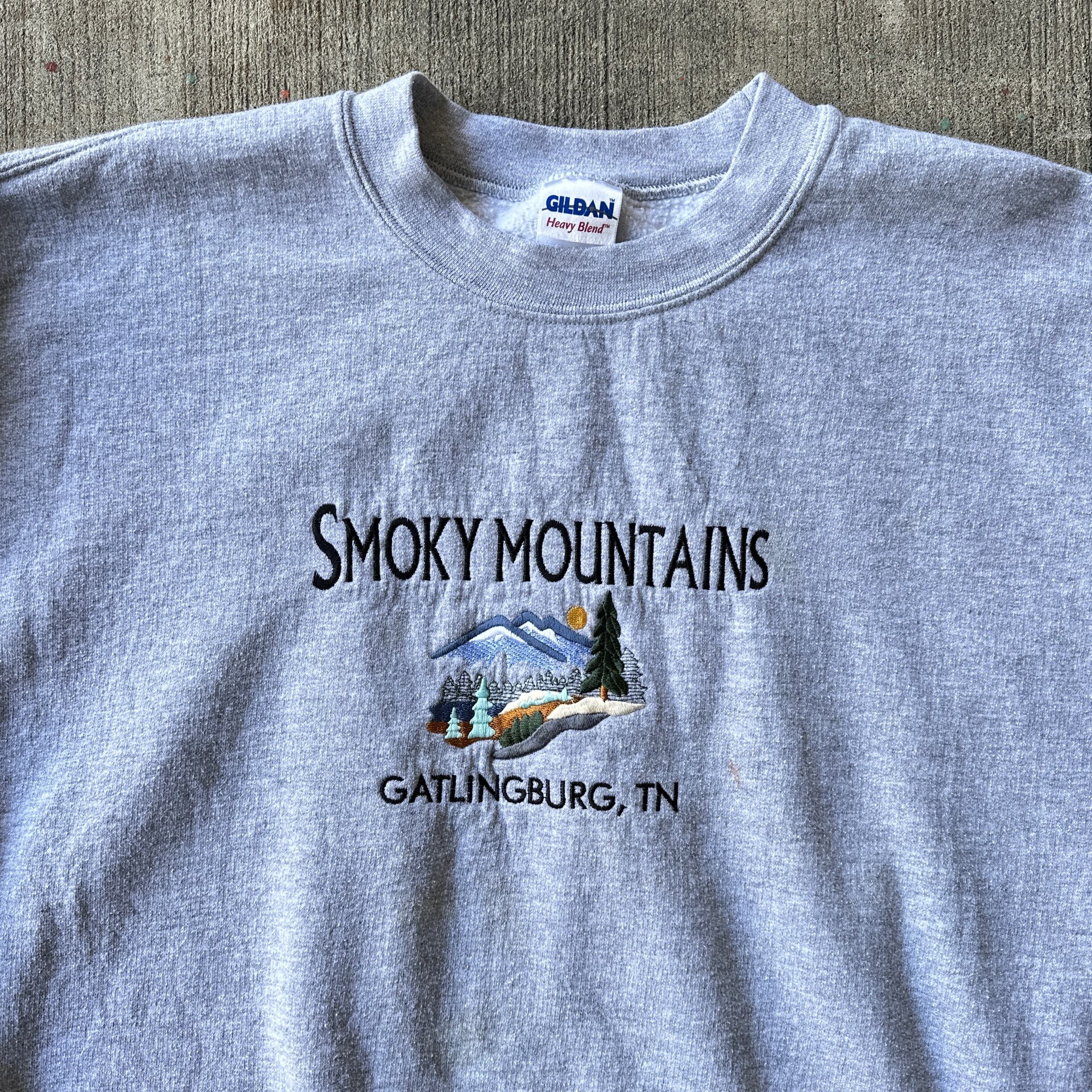 アメリカ・テネシー州ガットリンバーグにある山脈スモーキーマウンテンズの景色が刺繍でデザインされたスウェット。