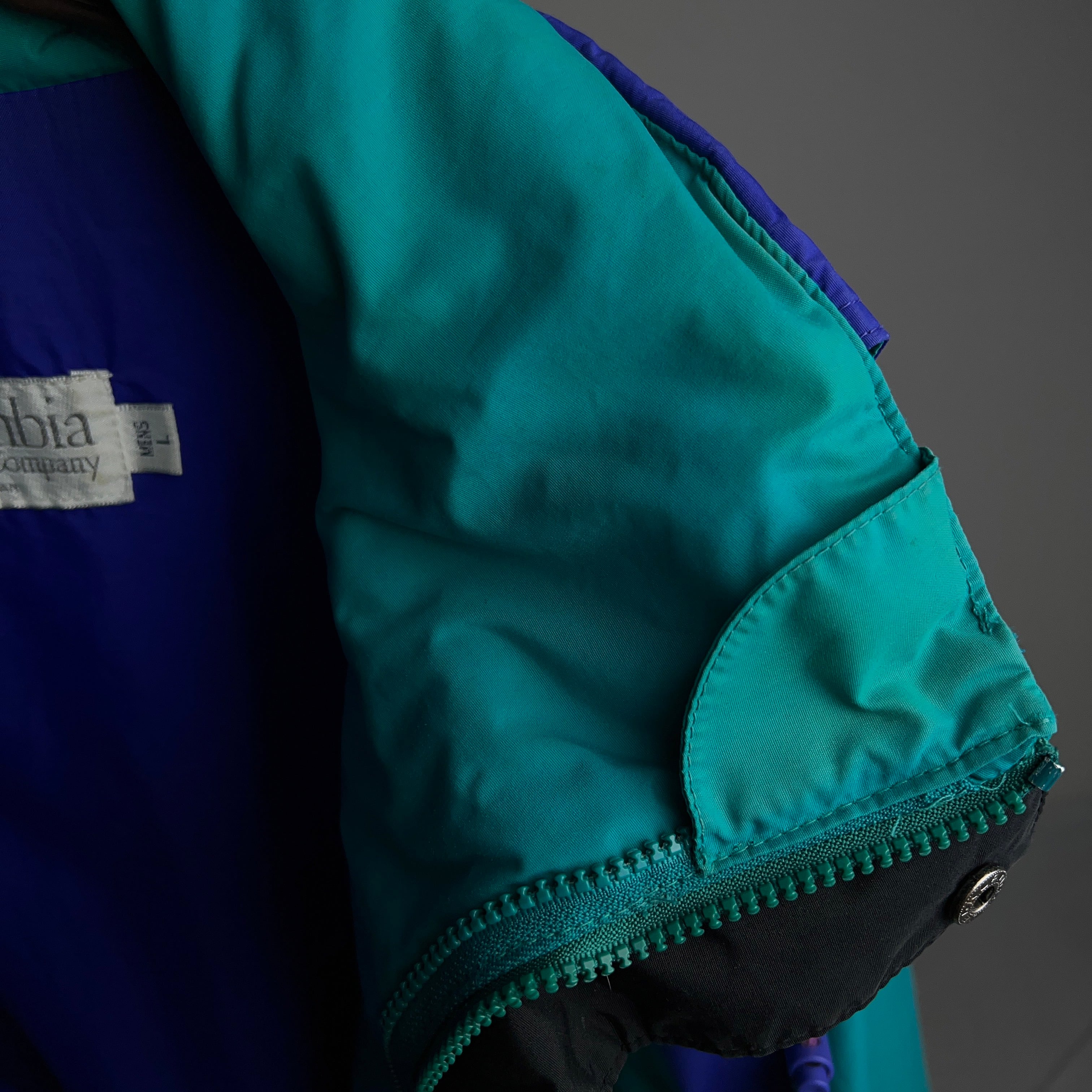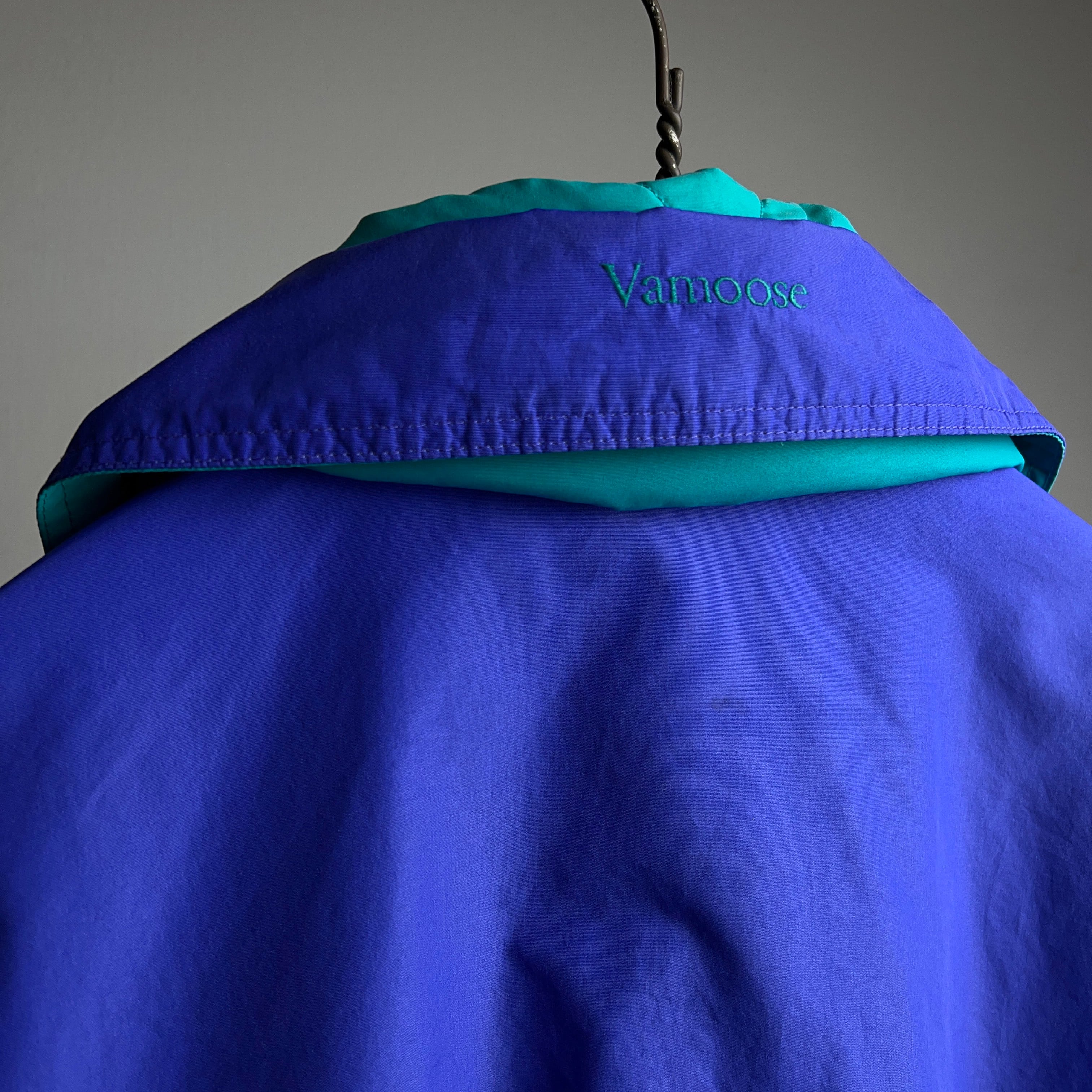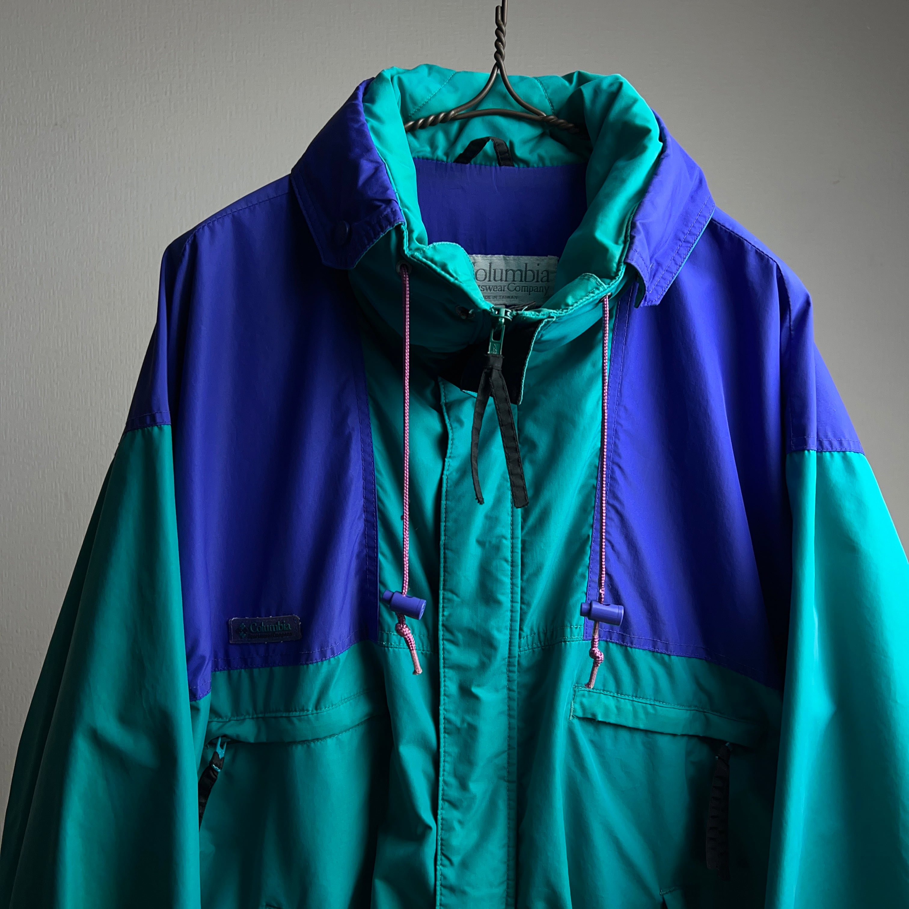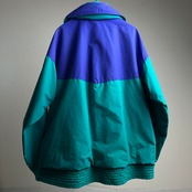 ターコイズグリーンとパープルの2色使いで90年代感のあるレトロなナイロンジャケットとなります。