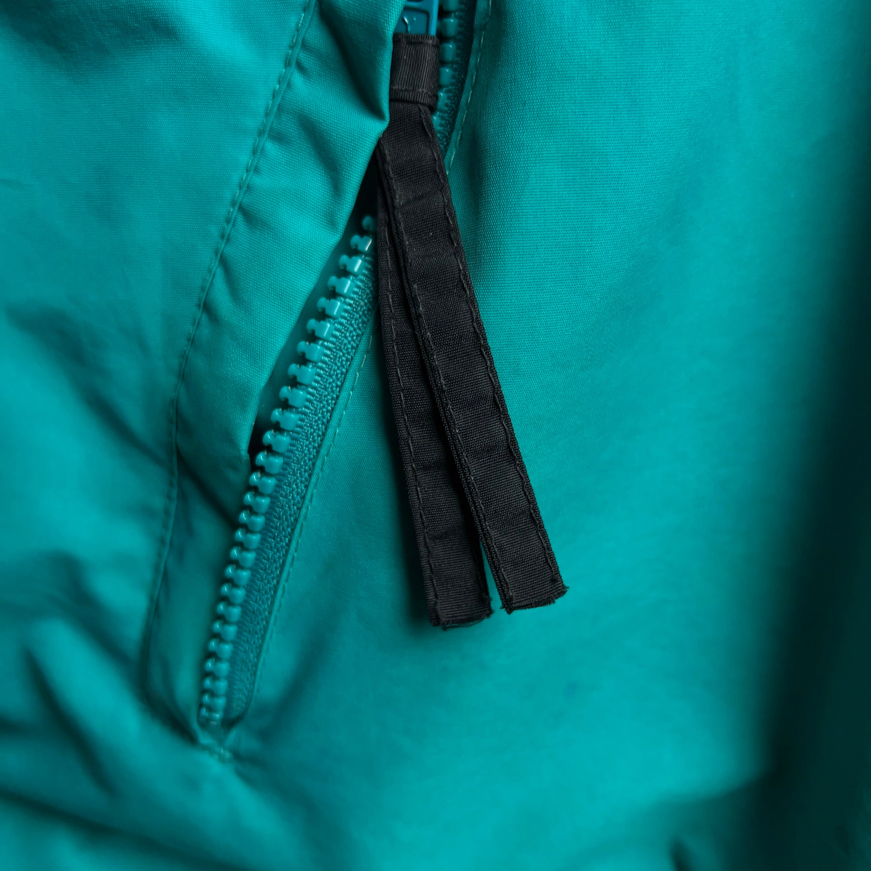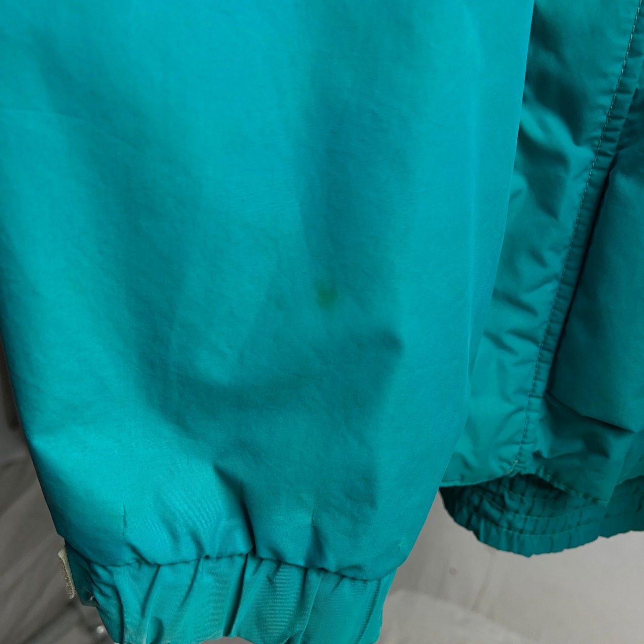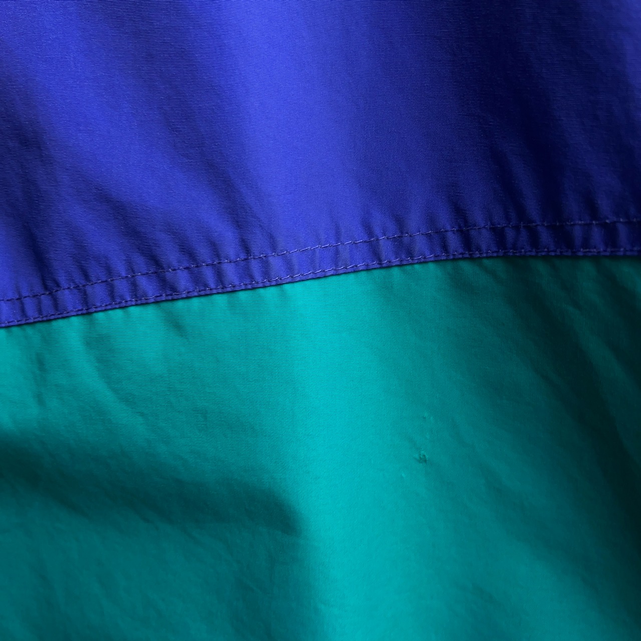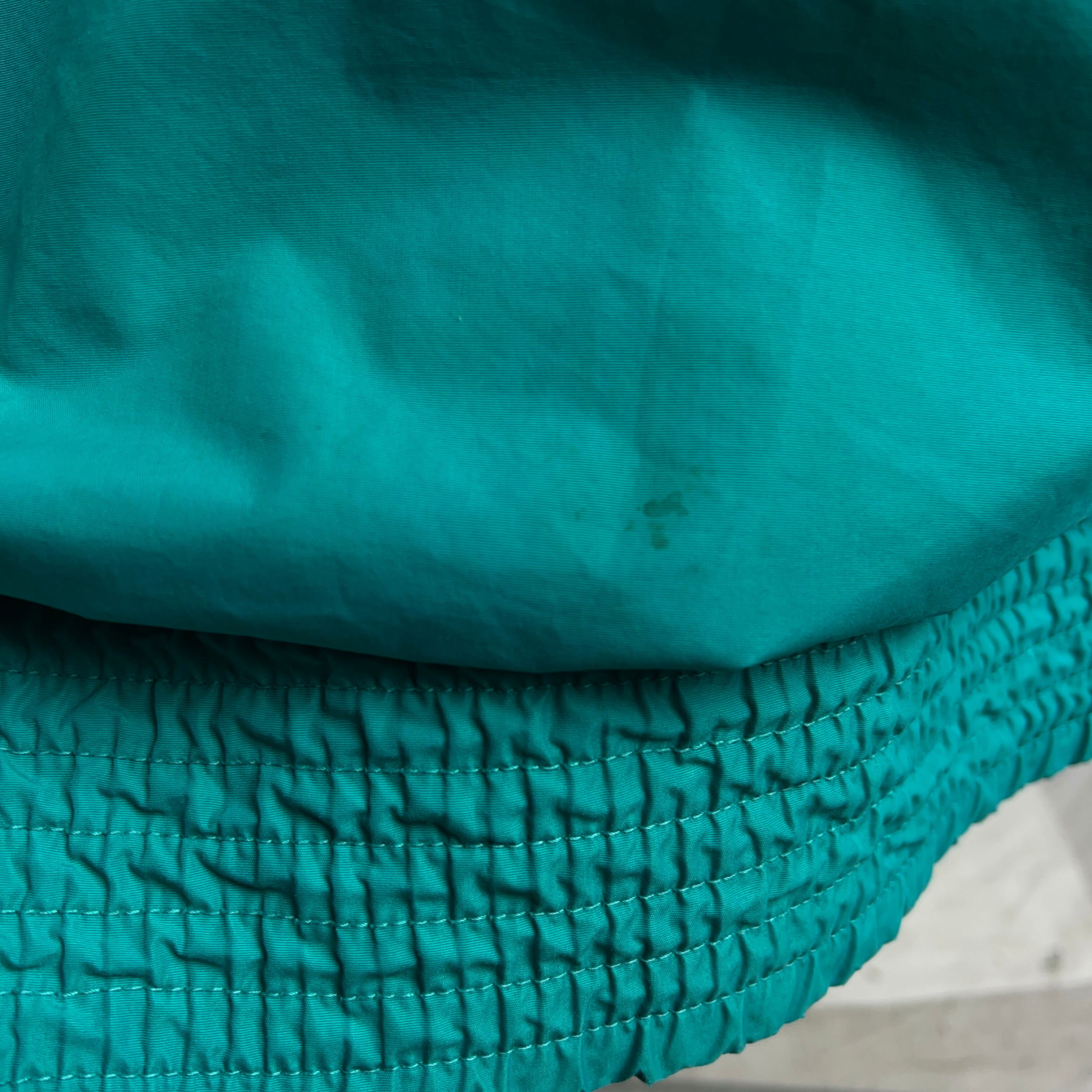 ターコイズグリーンとパープルの2色使いで90年代感のあるレトロなナイロンジャケットとなります。