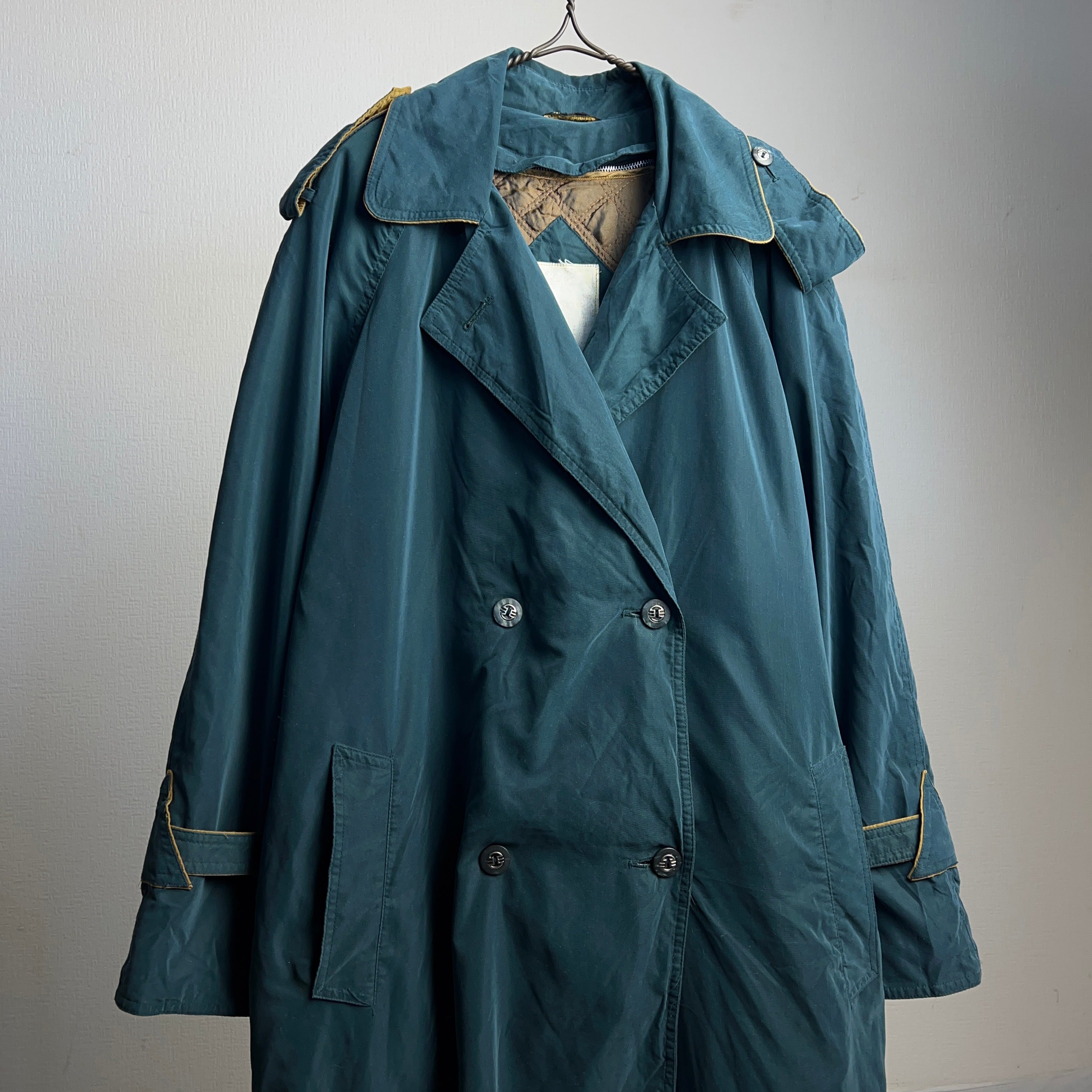 パイピングデザインやダークグリーンの配色など普通のトレンチコートとは大きく異なった仕様。