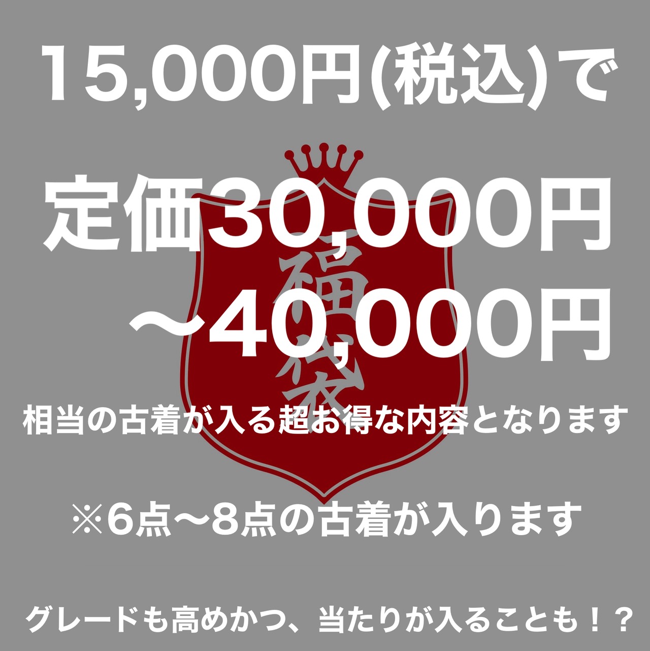 2023福袋の中身は【15,000円(税込)で30,000から40,000円(税込)相当分のアイテムが入る】当店の古着セットの中で1番お買い得な内容となります。