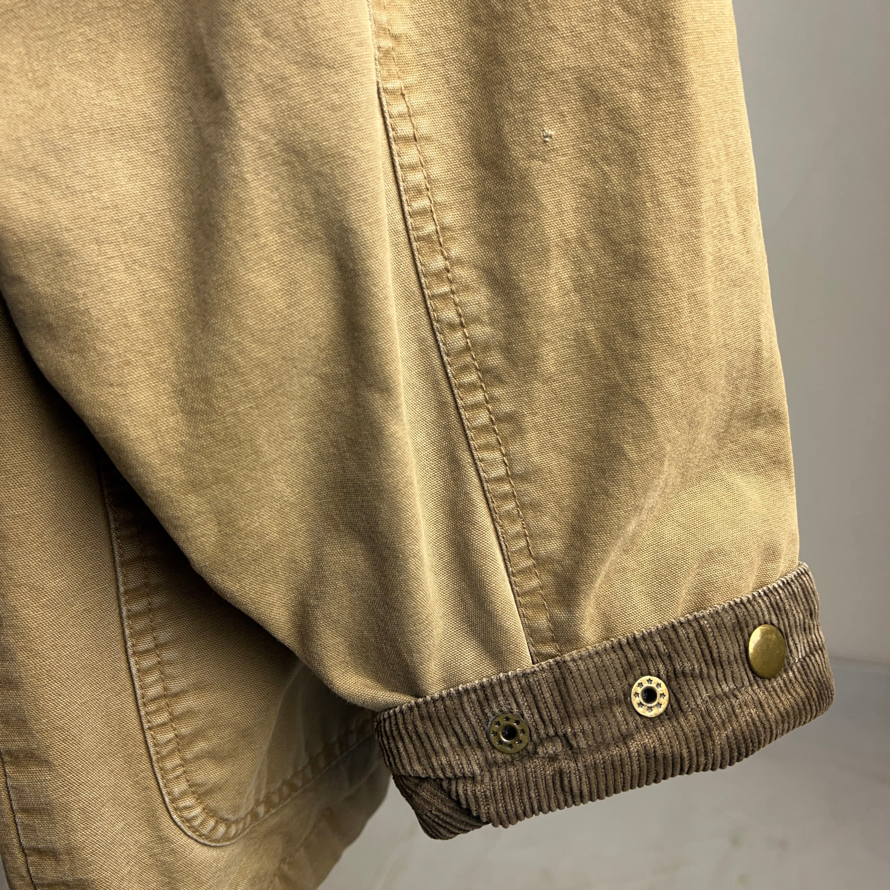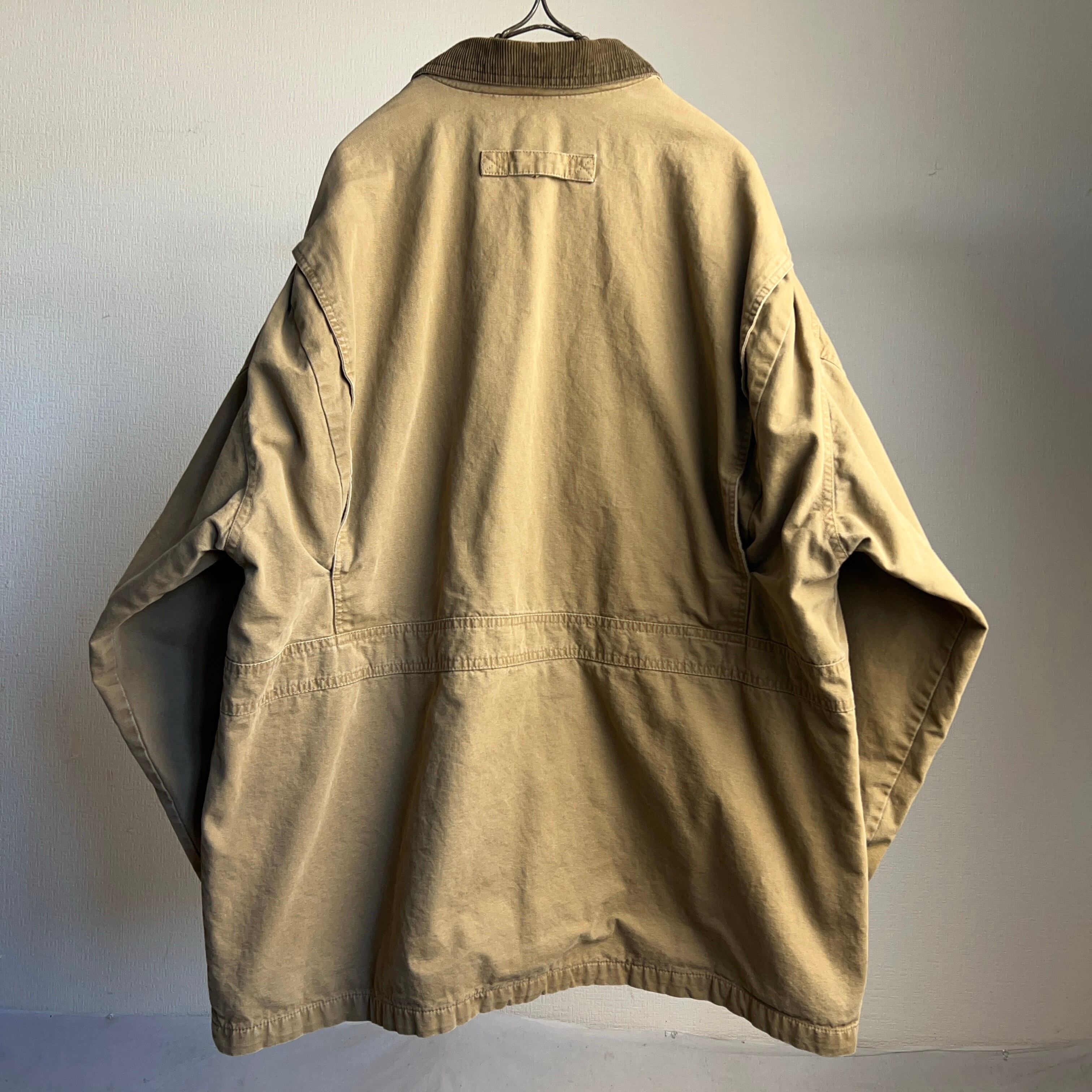 襟がコーデュロイ切り替えとなったカバーオールのようなミドル丈デザインで古着っぽさがあり古着屋スタッフにも人気があるジャケットです。