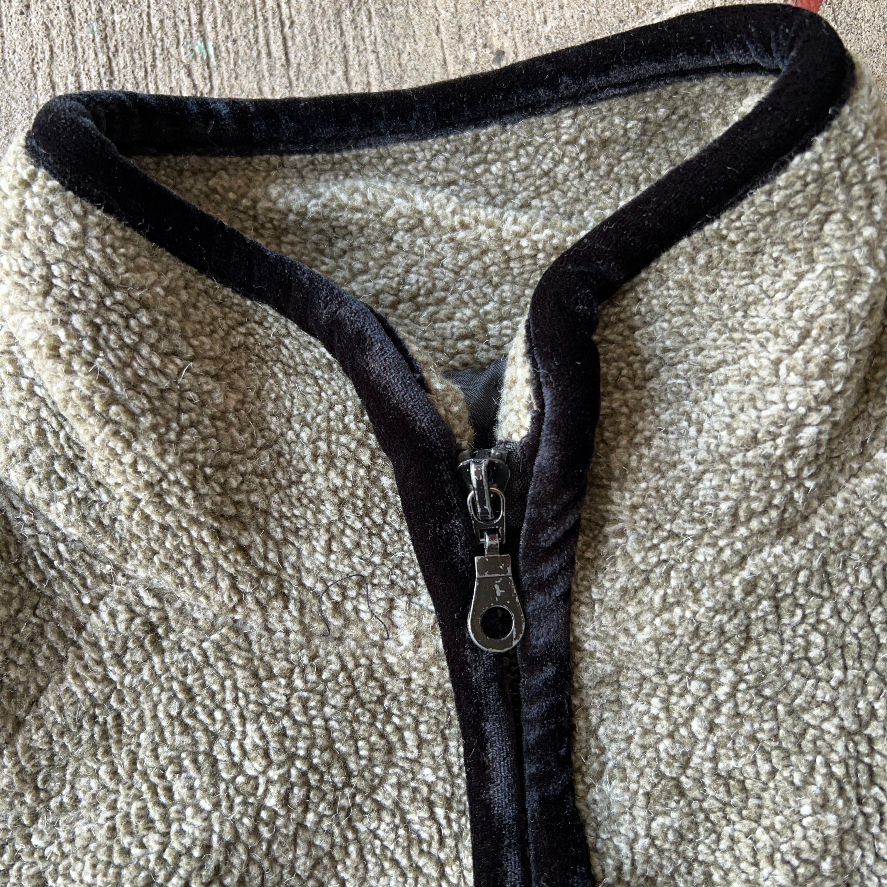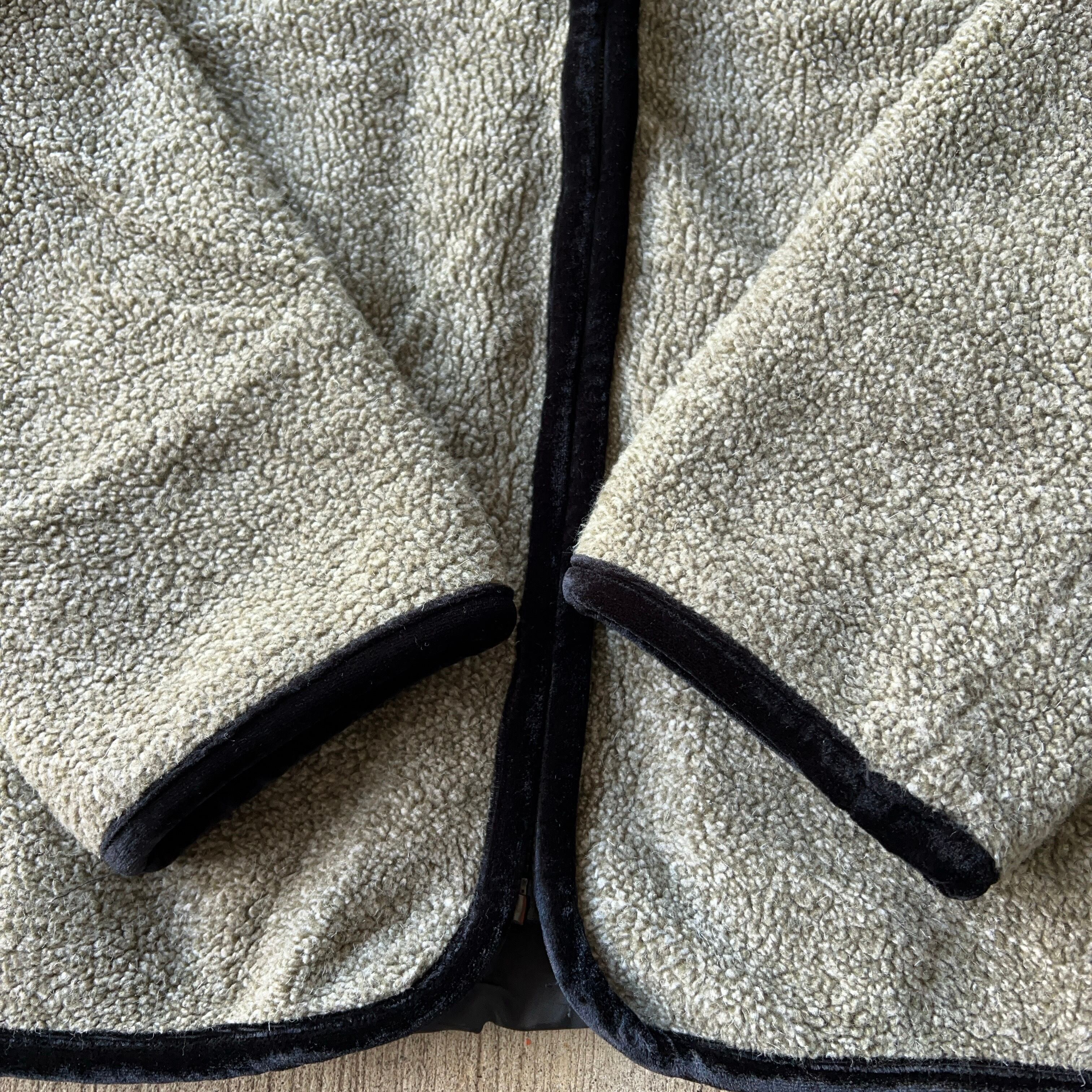 くすみカラーのボディと、ベロア生地のブラックラインがお洒落なフリースジャケット。モコモコ感が可愛いですね。