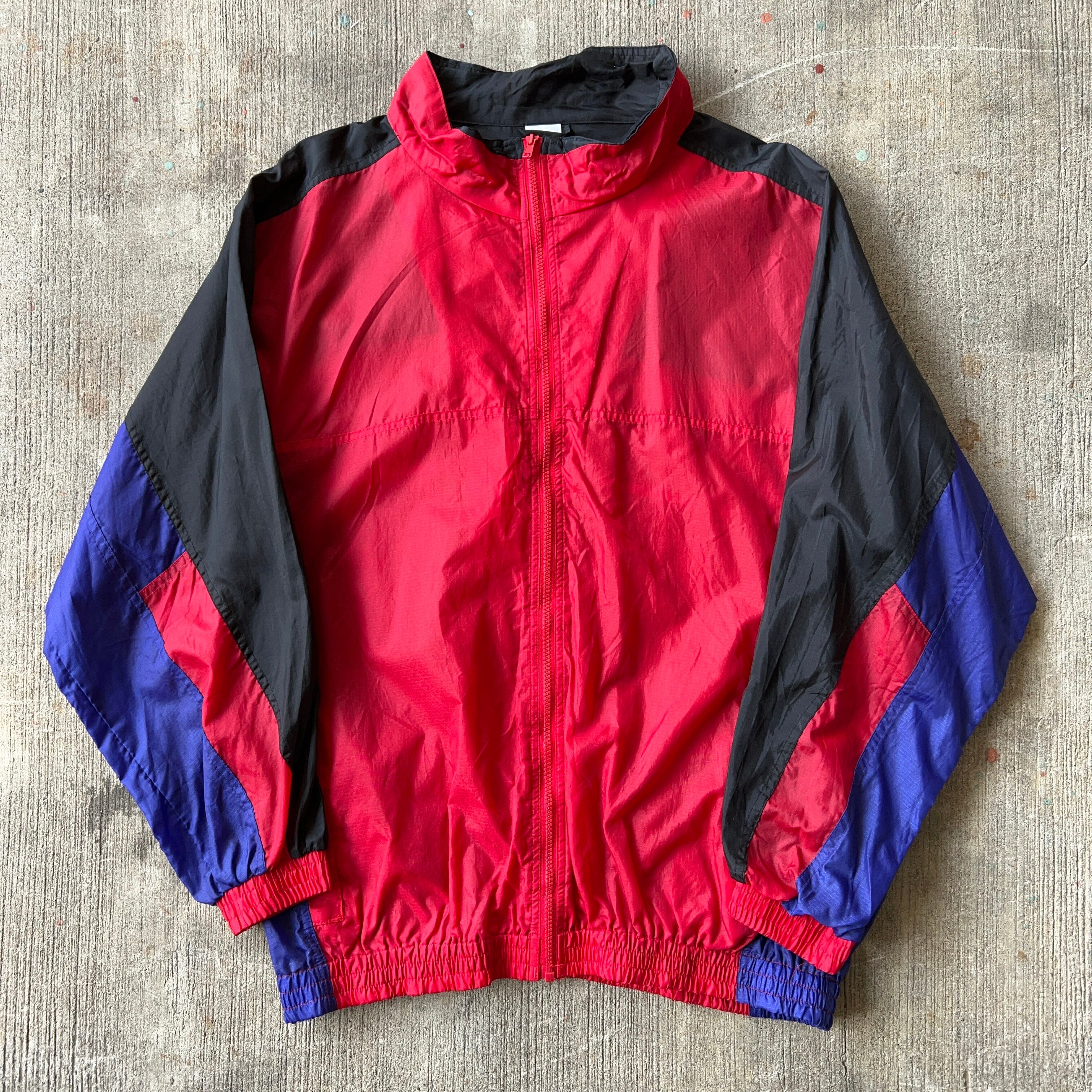 今季トレンドのレッドと紫に近いブルー、ブラックを使ったマルチカラーナイロンジャケット。