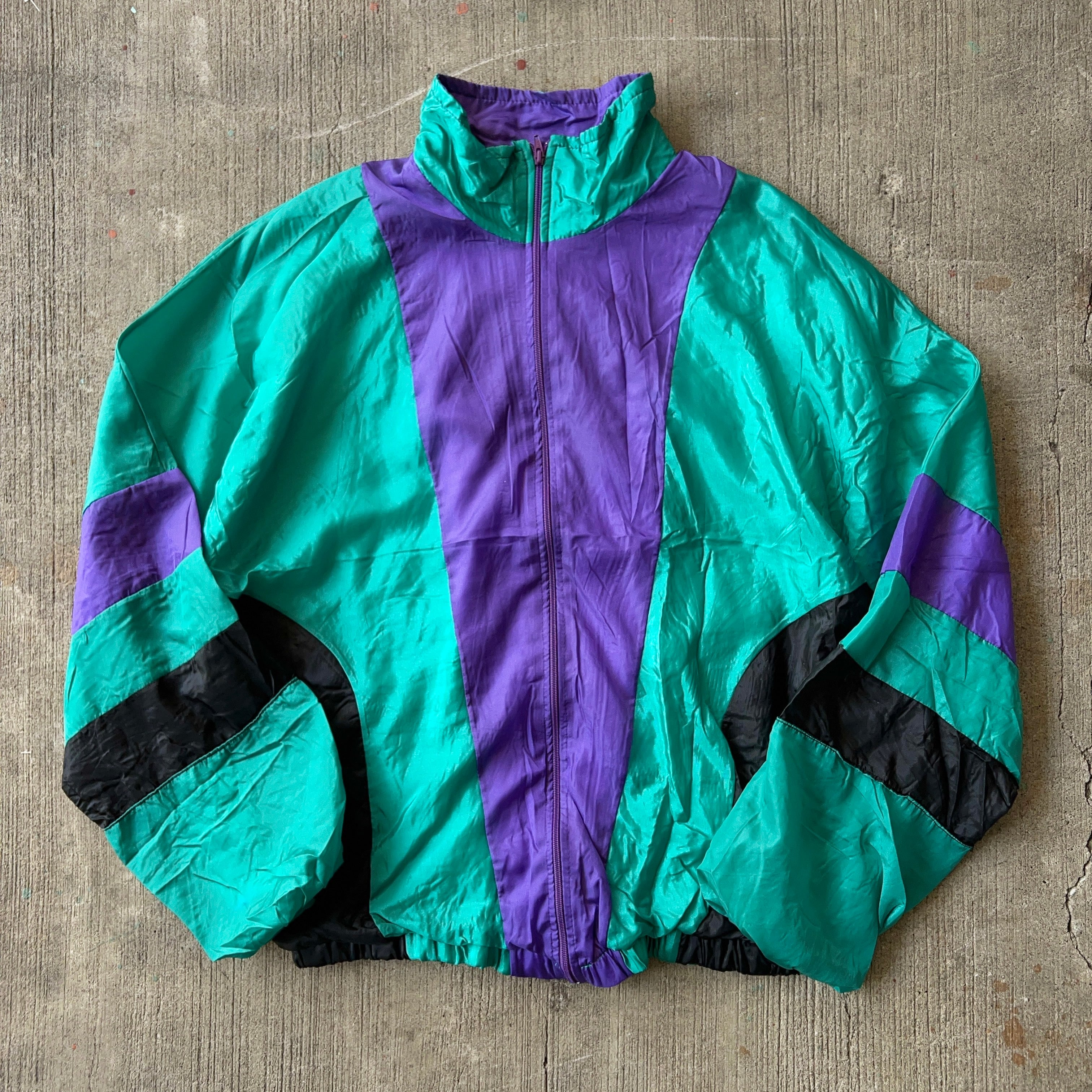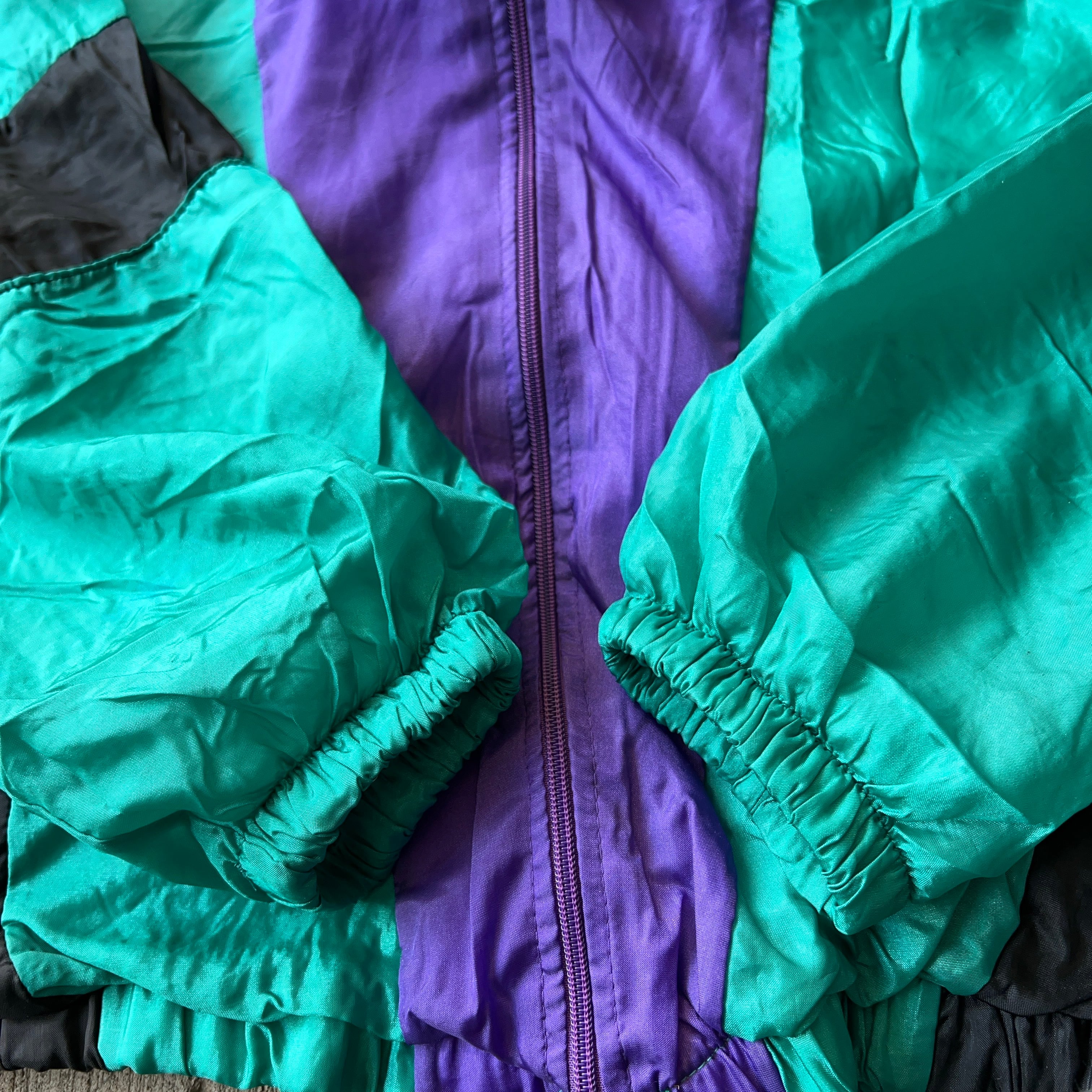 光沢感のある緑みのブルーとパープルのお洒落な配色のナイロンジャケットです。