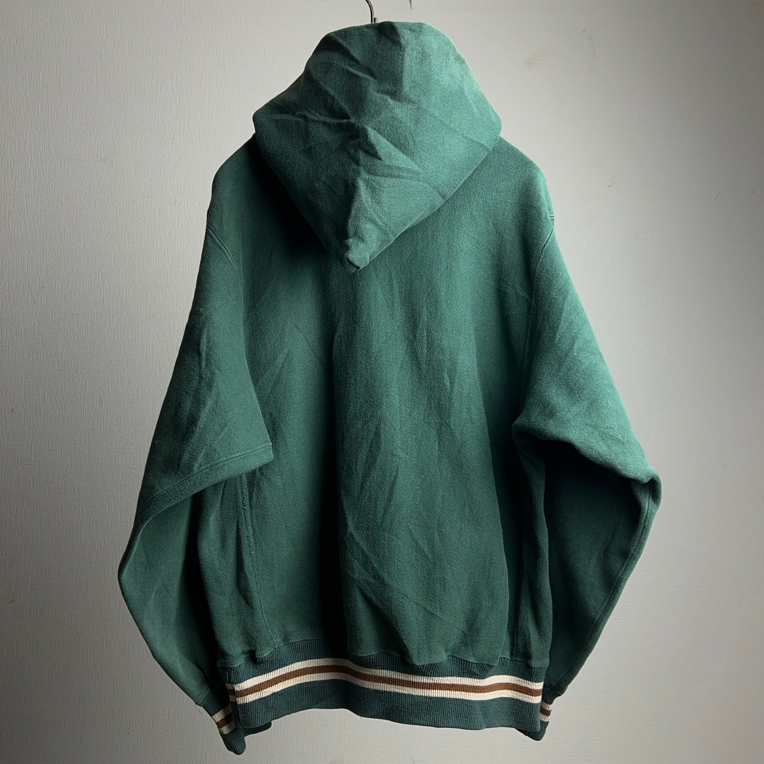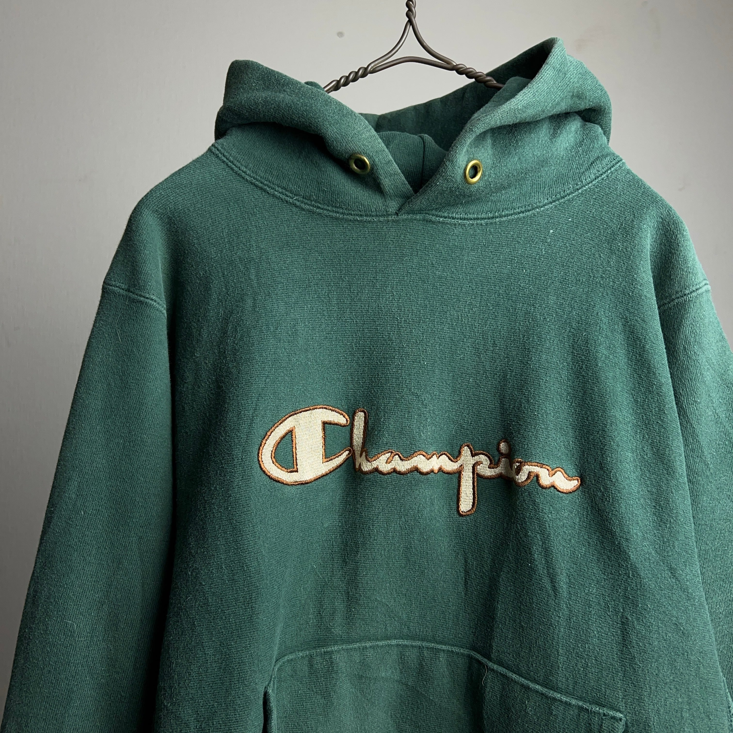 90's Champion Reverse Weave Hoodie Parka USA製 SIZE M 90年代 チャンピオン リバースウィーブ パーカー スウェット グリーン アメリカ製 刺繍 リブライン スクリプトロゴ【1000A1202】【送料無料】