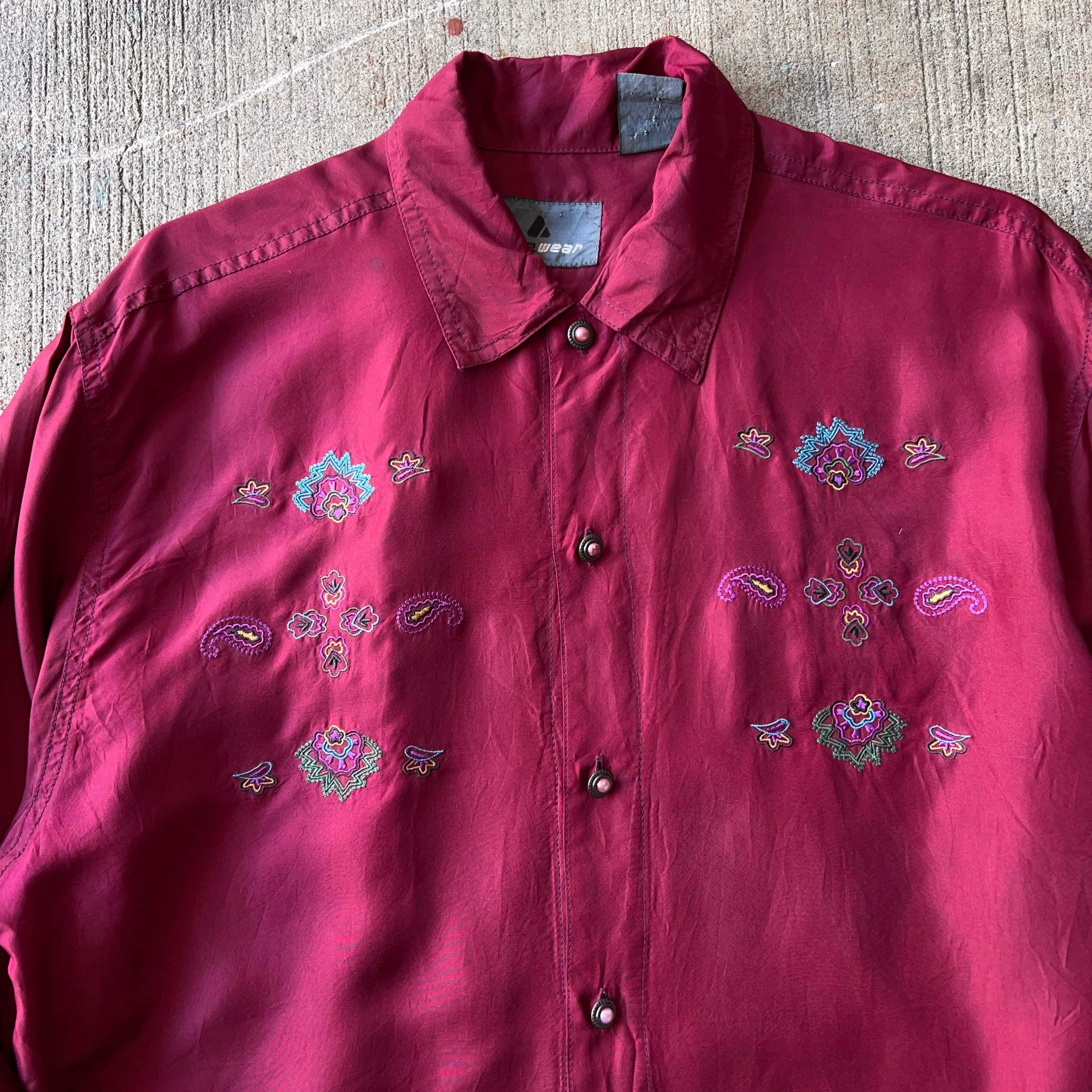 90's Liz wear Silk Shirt SIZE S 90年代 シルクシャツ 刺繍 長袖シャツ ワインレッド えんじ【3000円均一商品】【2点以上の購入で1000円OFF】【TH0630】