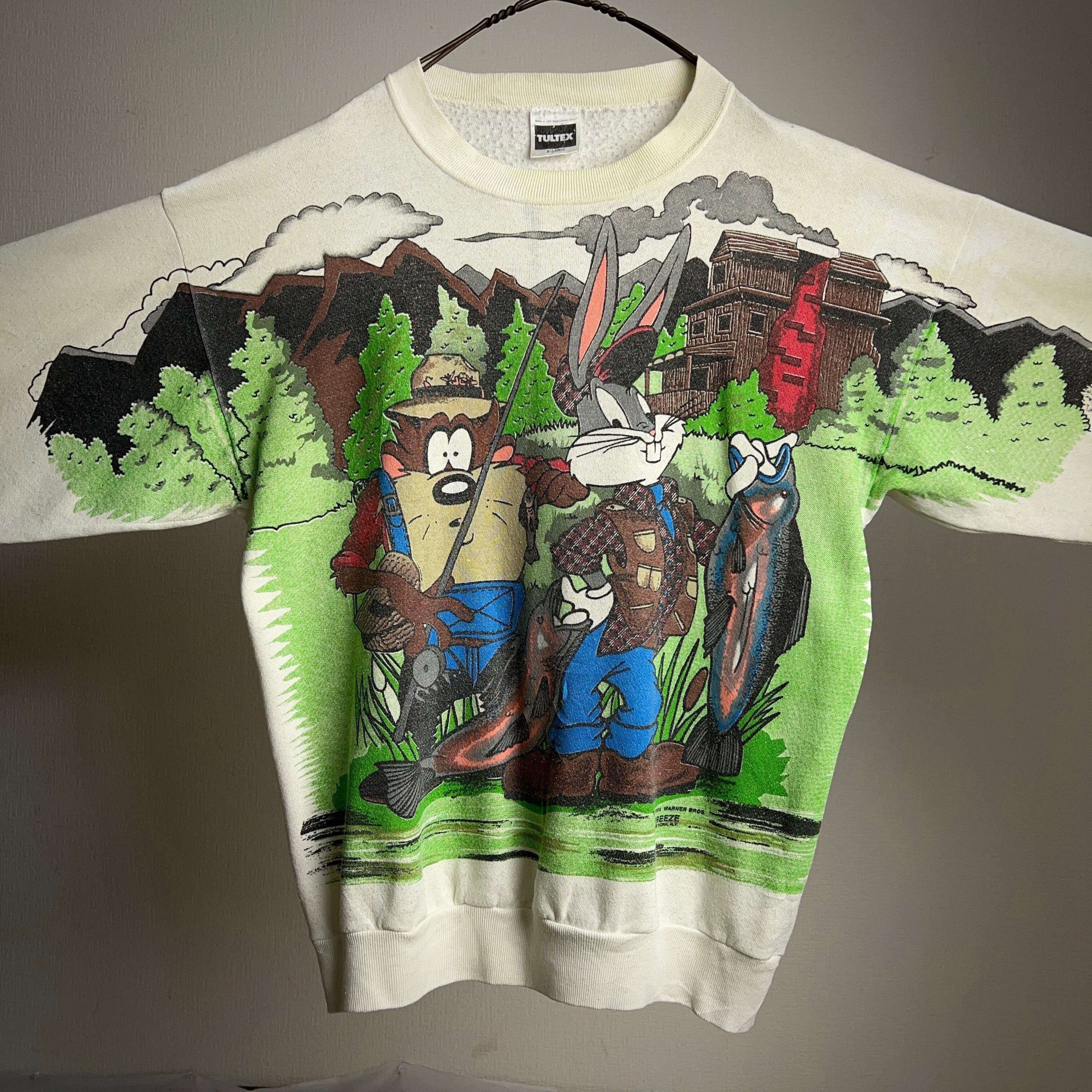 ルーニーテューンズの人気キャラクター、バッグス・バニーとタズマニアンデビルがフィッシングを楽しむプリントのヴィンテージスウェット。