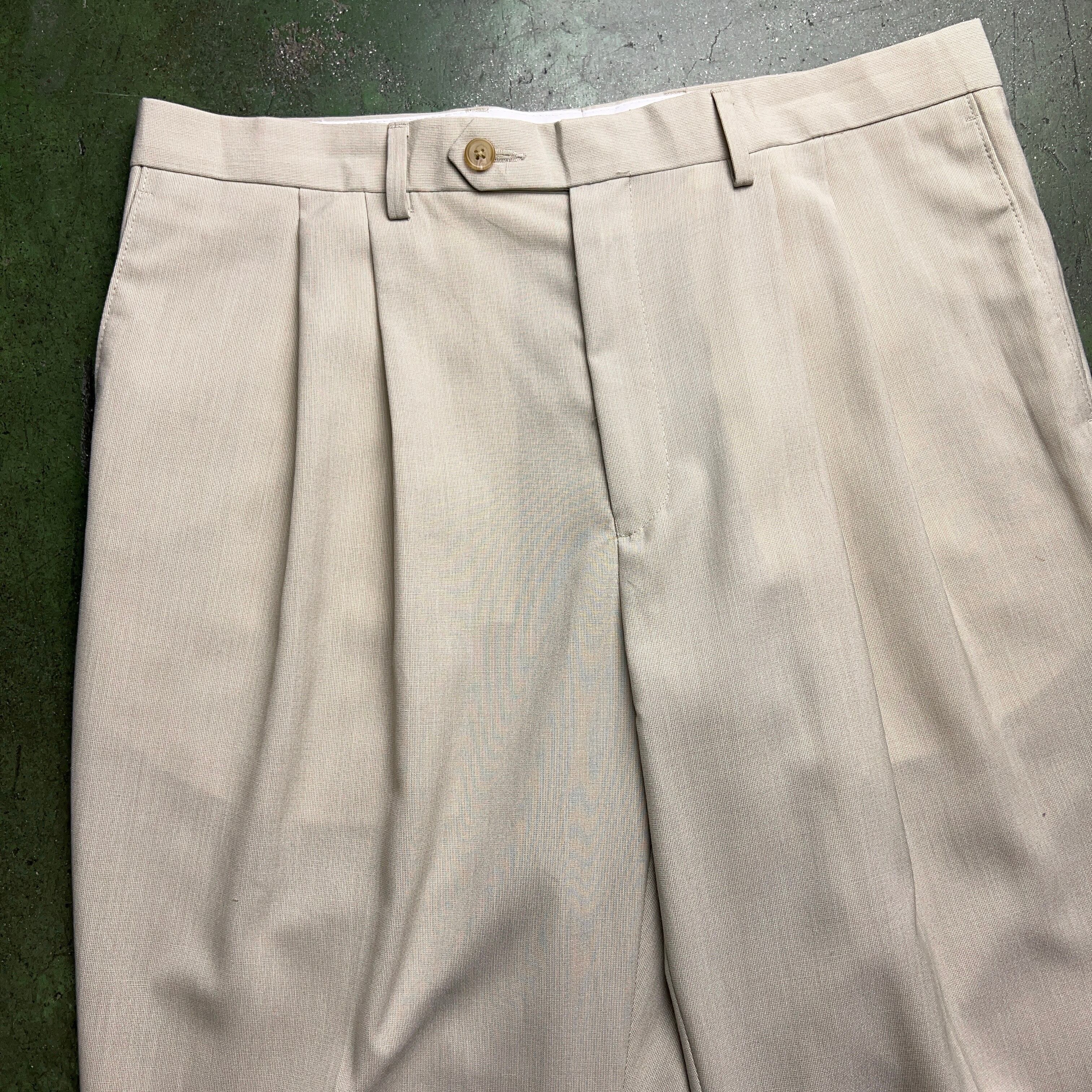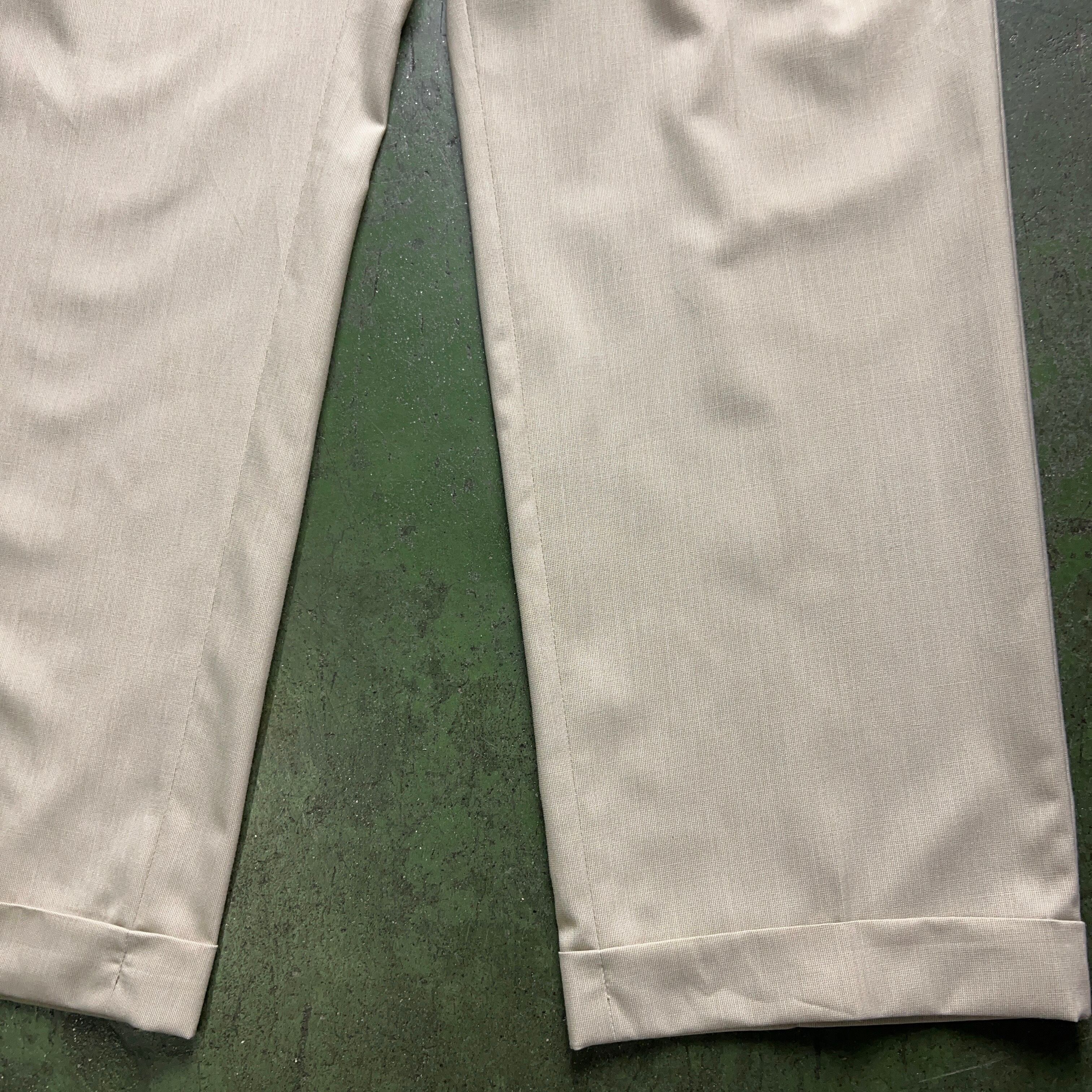 明るいアイボリーカラーに2タックワイドシルエットでどんな服装にも合わせやすくW34×L32と程よいサイズ感と成っております。