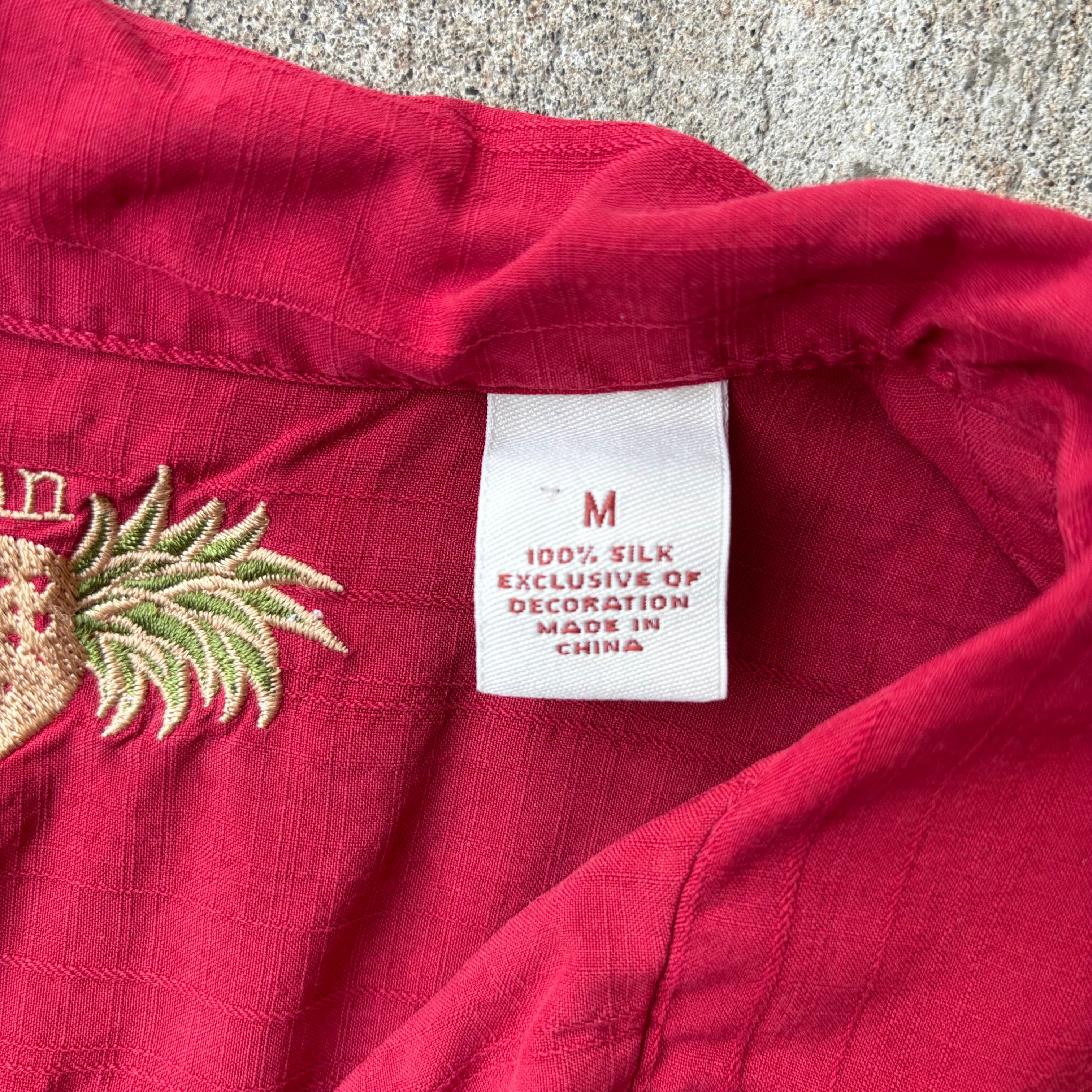90s "Caribbean" Silk Open Collar Shirts Pattern シルク 開襟 半袖シャツ 赤 レッド 色褪せ 色落ち フェード【3000円均一商品】【TH0726】