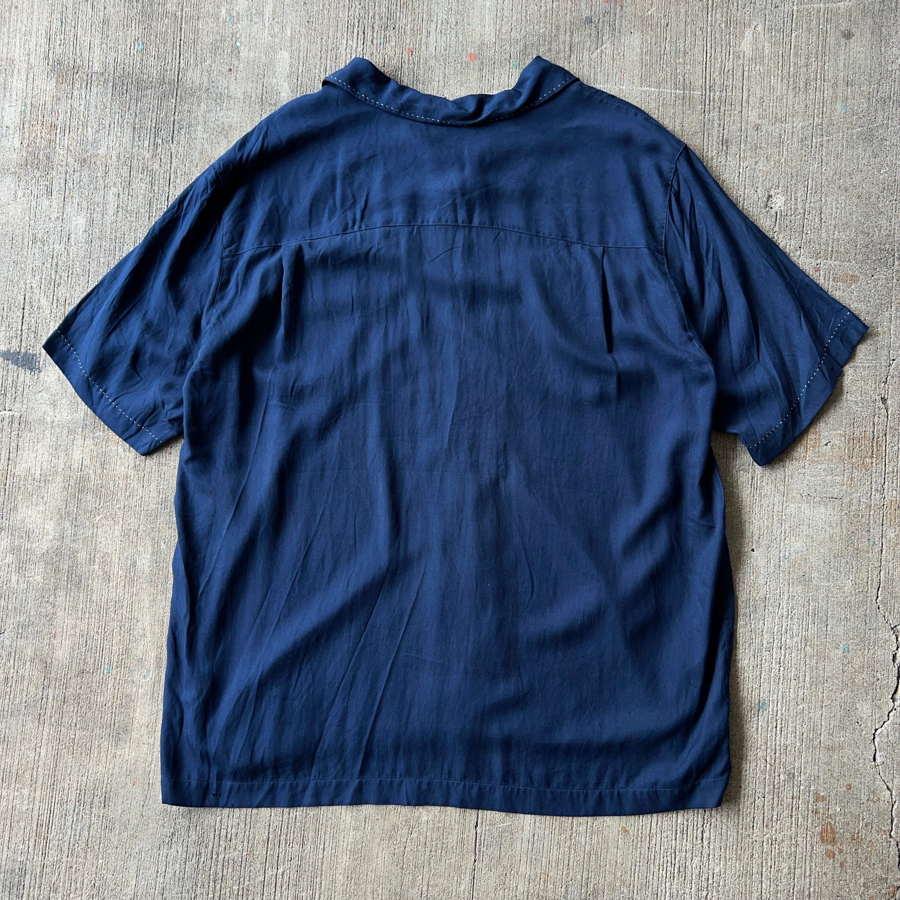 "BRANDINI" Silk 2Pocket Open Collar Shirts シルク 開襟 2ポケット ボックスシルエット 半袖シャツ ネイビー 紺 アウトステッチ オープンカラー サイズXL【3000円均一商品】【2点以上の購入で1000円OFF】【TH0731】