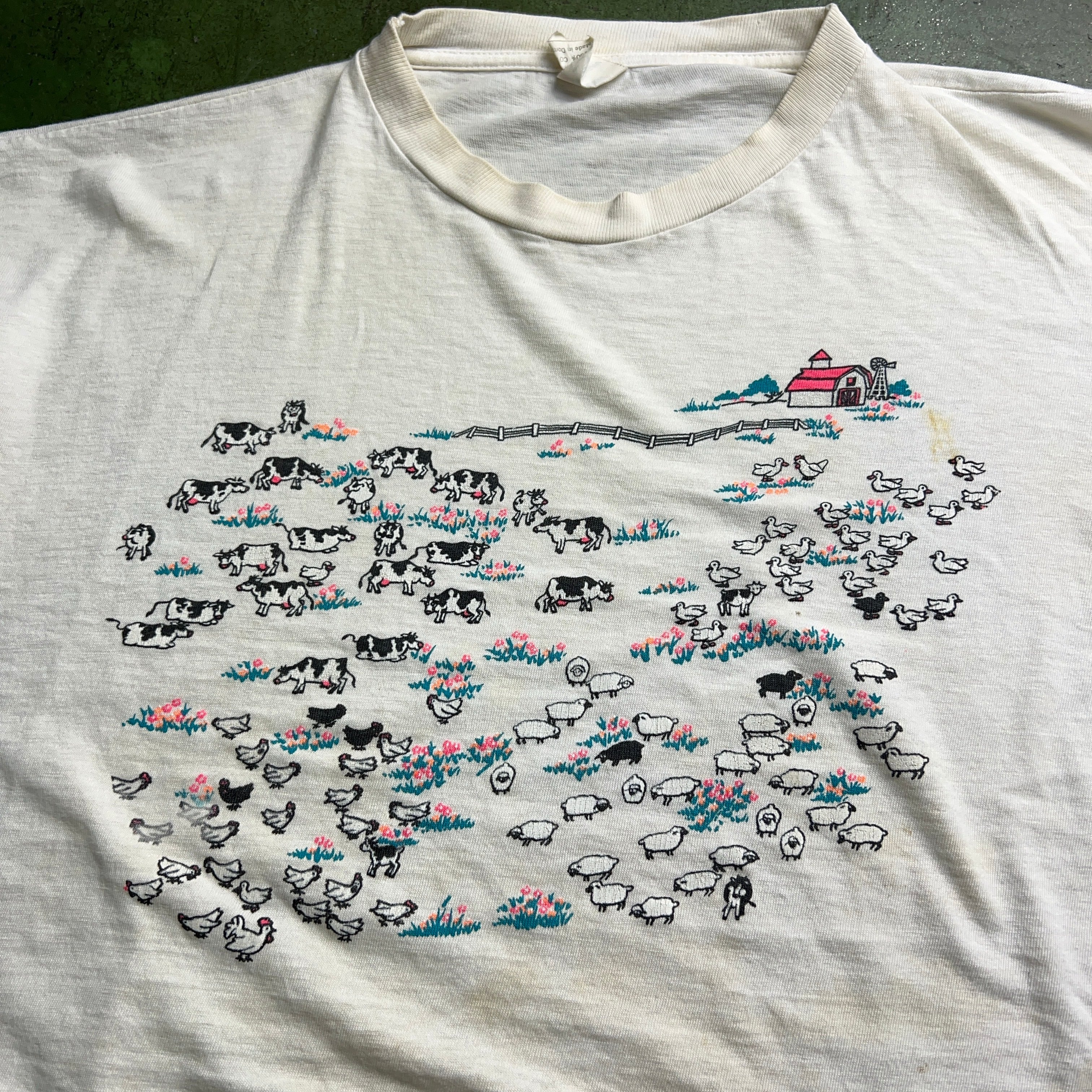 ~90's "RANCH" Art Tshirt 80年代 90年代 牧場 牛 鶏 羊 アート Tシャツ 白T ホワイト 襤褸 ボロ 【1000A2104】【ネコポス発送可能】