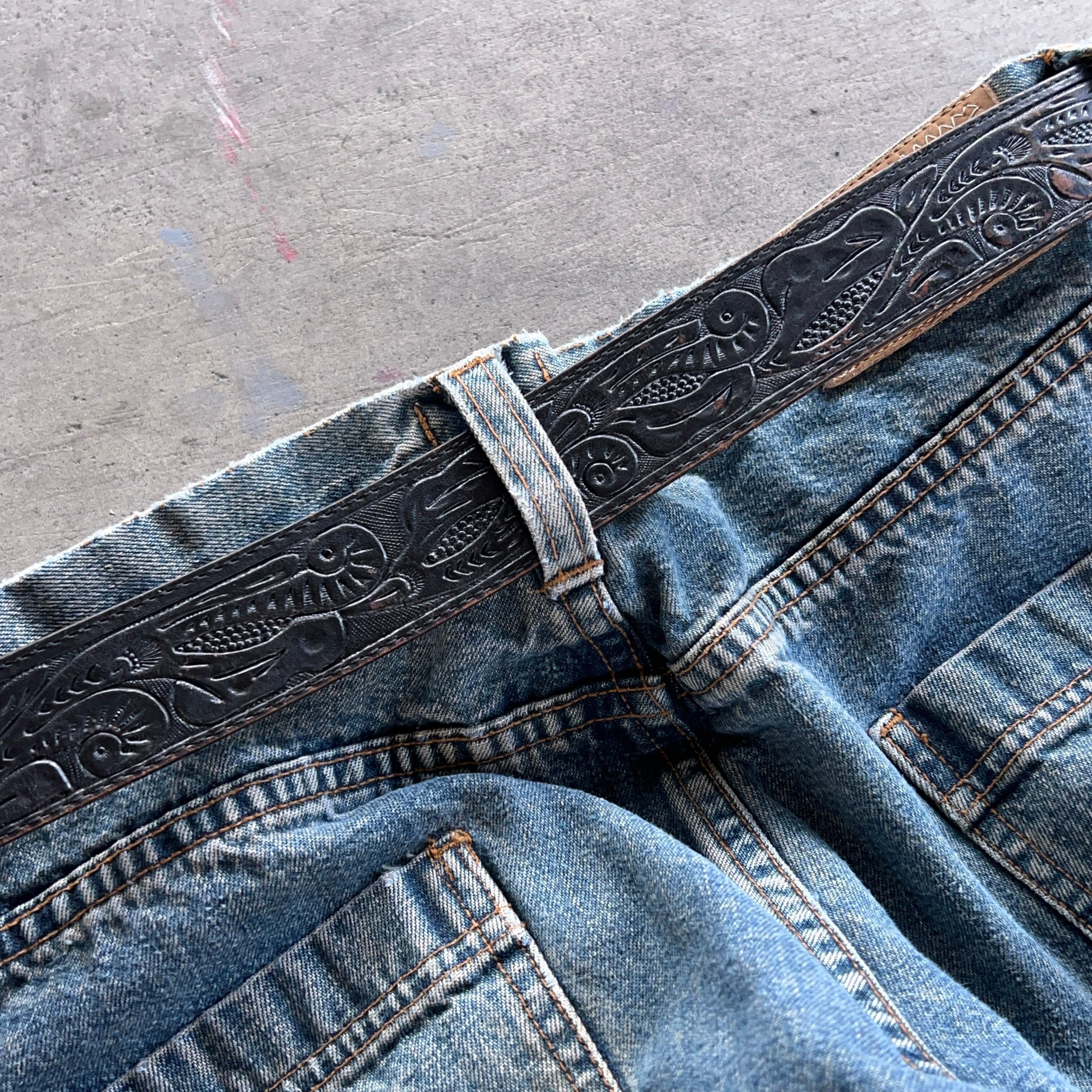 Vintage "THE HERITAGE COLLECTION" Leather Belt FULL GRAIN COWHIDE MADE IN USA ヴィンテージ レザーベルト バックル 型押し ブラック 黒 フルグレインカウハイド W32~36【1000A2138】【送料無料】
