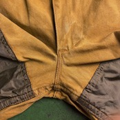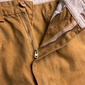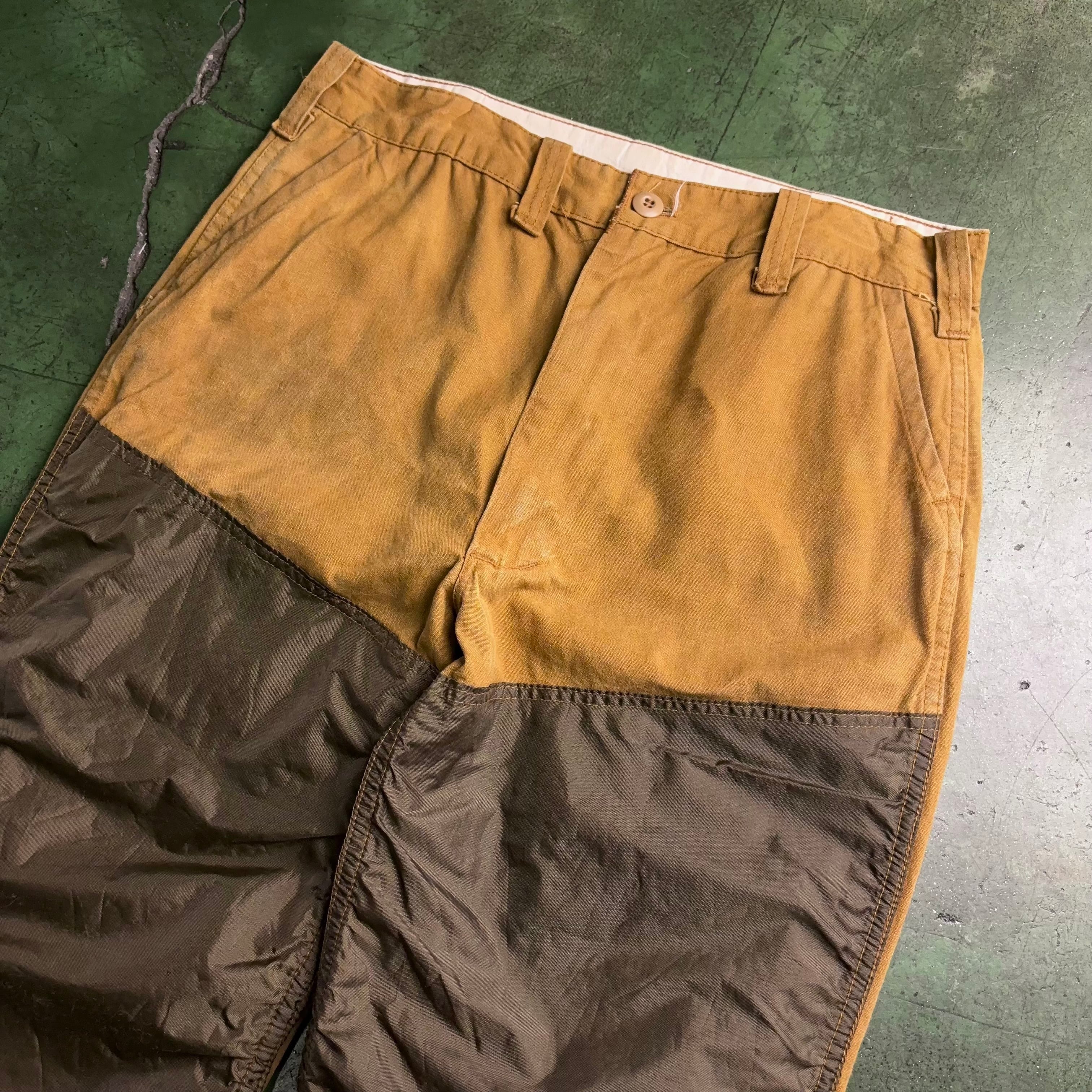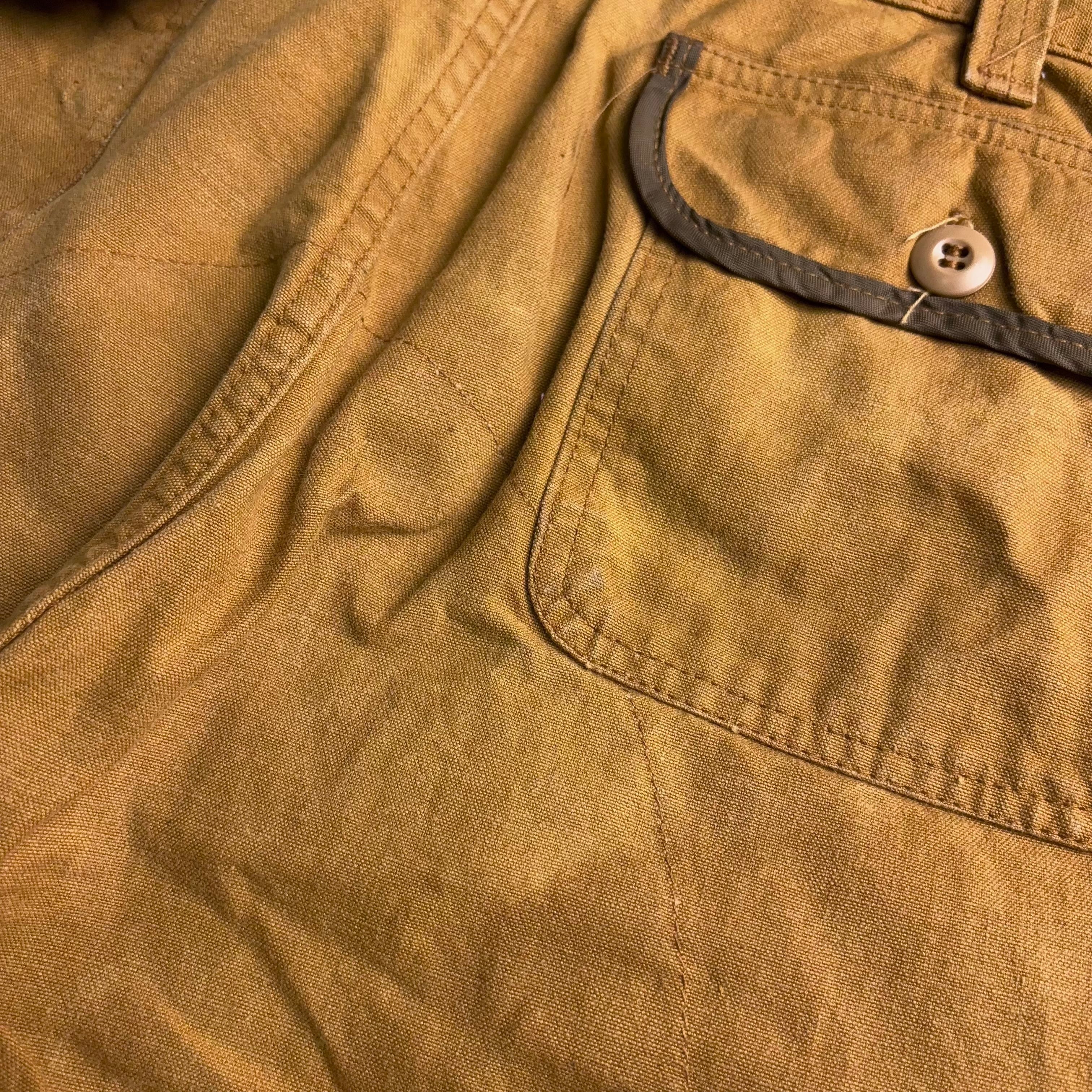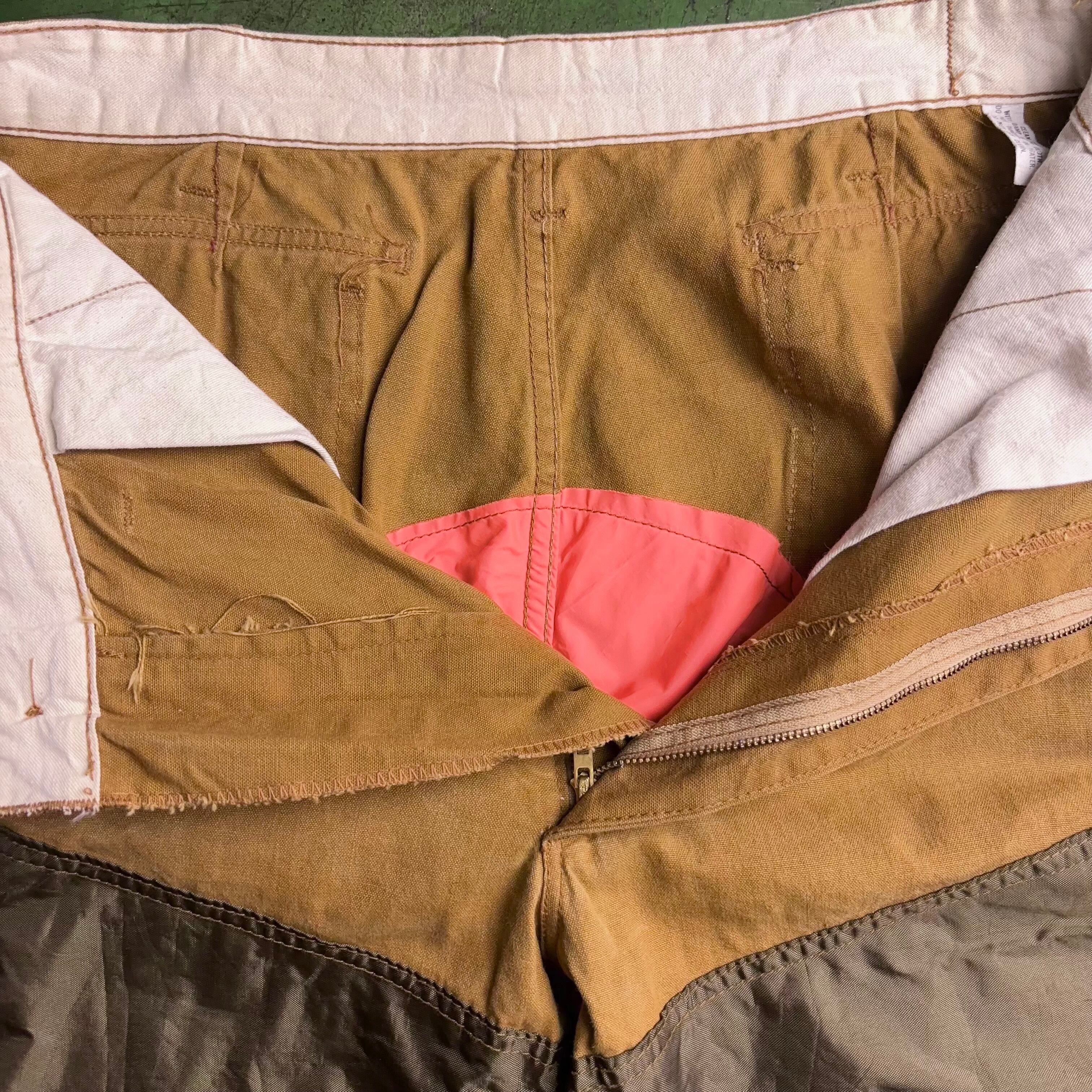 ダックやキャンバス生地に近い分厚いコットン生地が使われ、太腿から裾にかけてナイロン生地を被せた2重構造となっています。