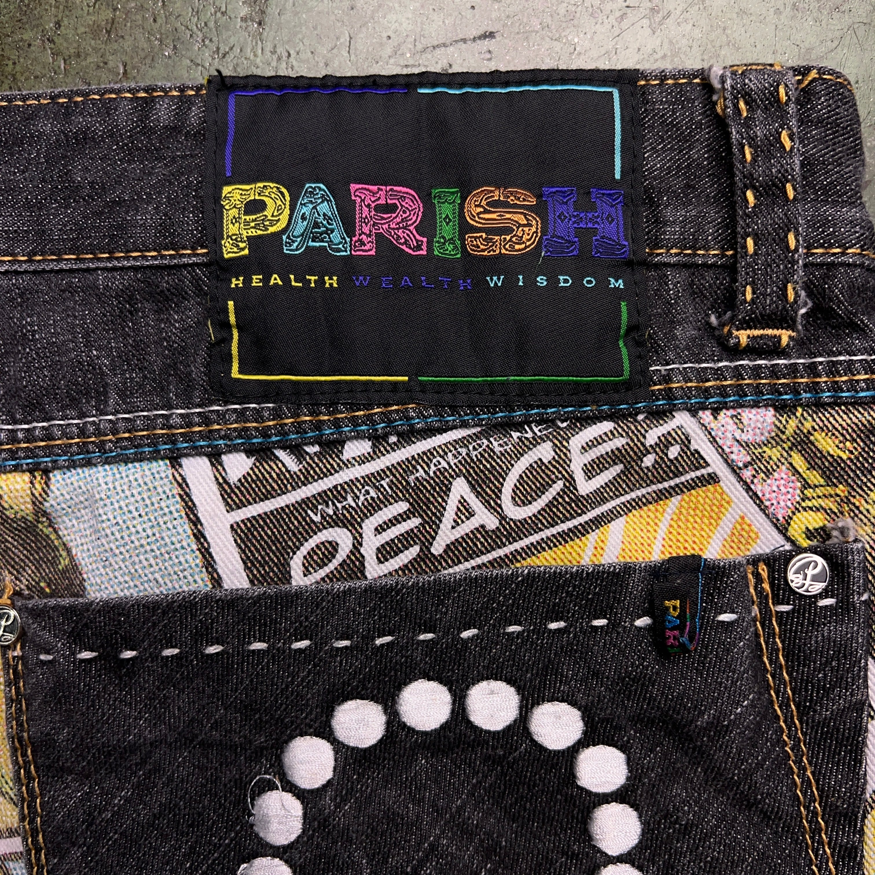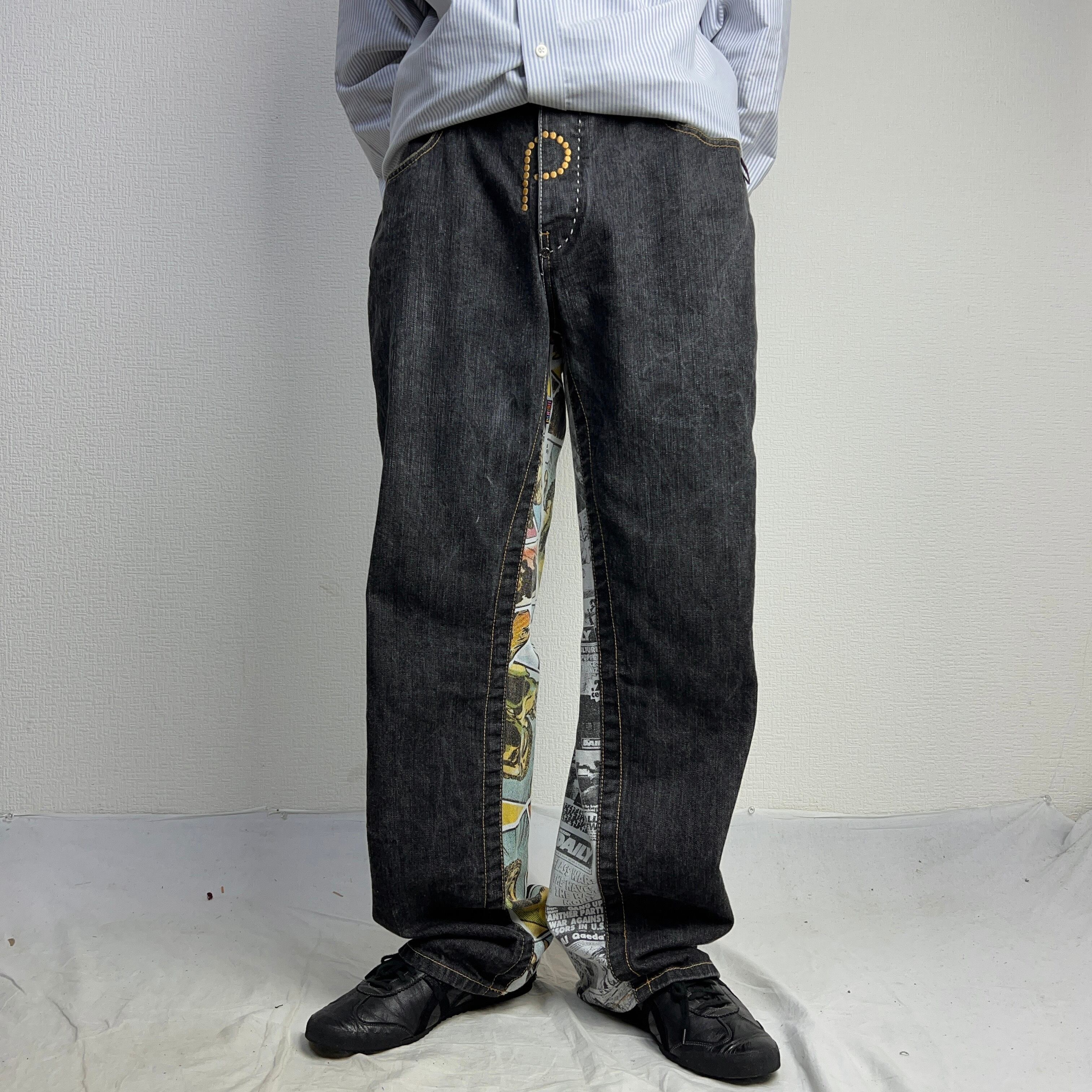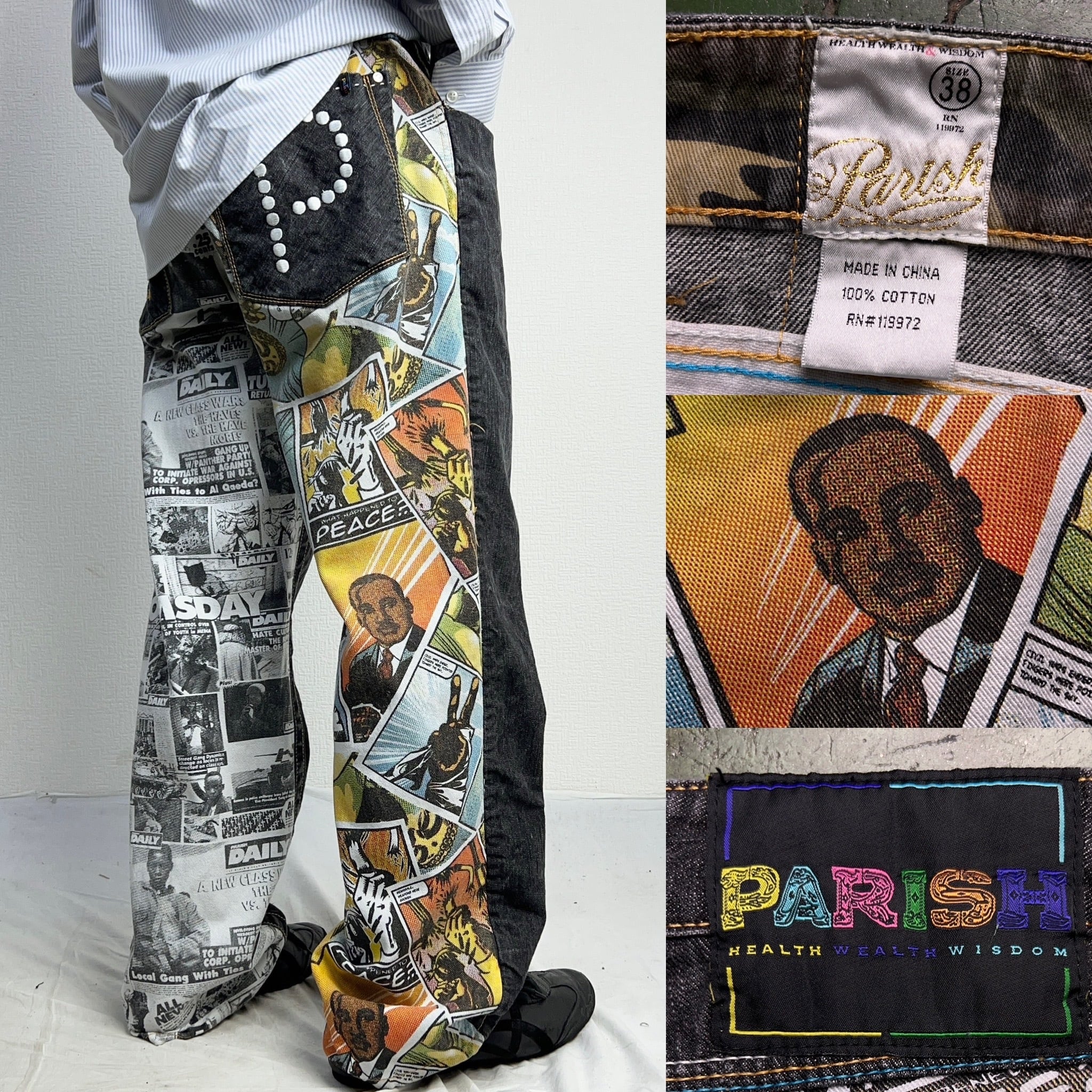 PARISH PATTERNED BLACK JEANS W38 総柄 デザイン ブラックデニム キング牧師 平和 デザイン ワイドデニム【1000A2210】