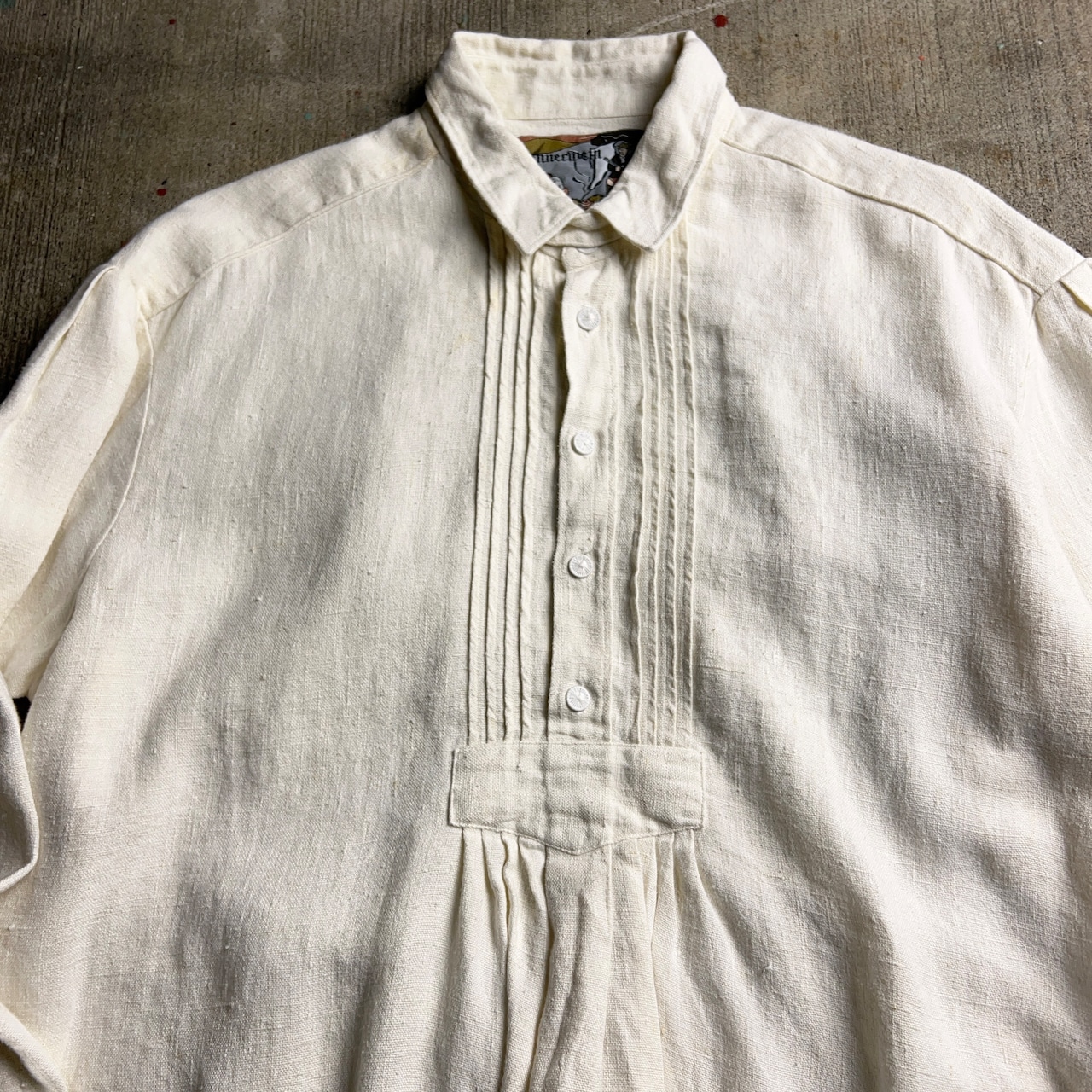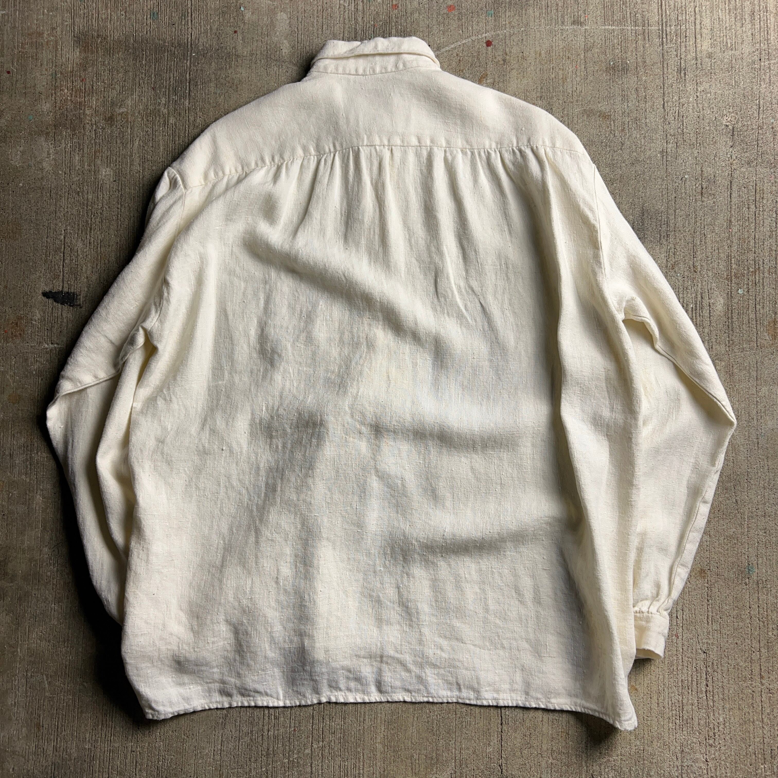 90's EURO Linen Pullover Shirt ユーロ リネンプルオーバーシャツ 白 ドレスシャツ ギャザー ハンティング 麻【1000A2246】