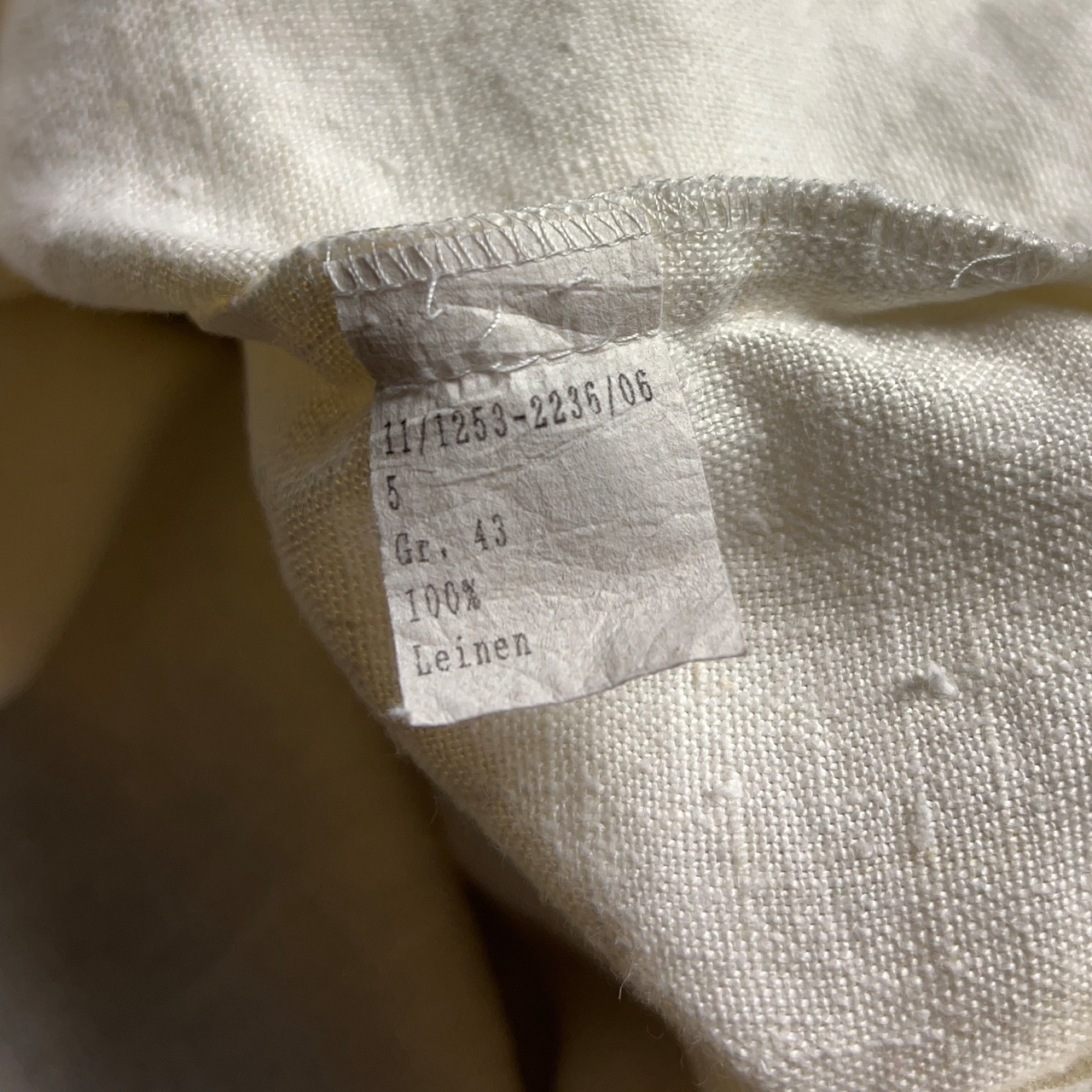 トロトロしたアンティーク感のあるリネン生地でゆとりのあるシルエット。タグにハンティングの絵柄があるのでユーロのハンティングシャツ仕様なんだと思われます。