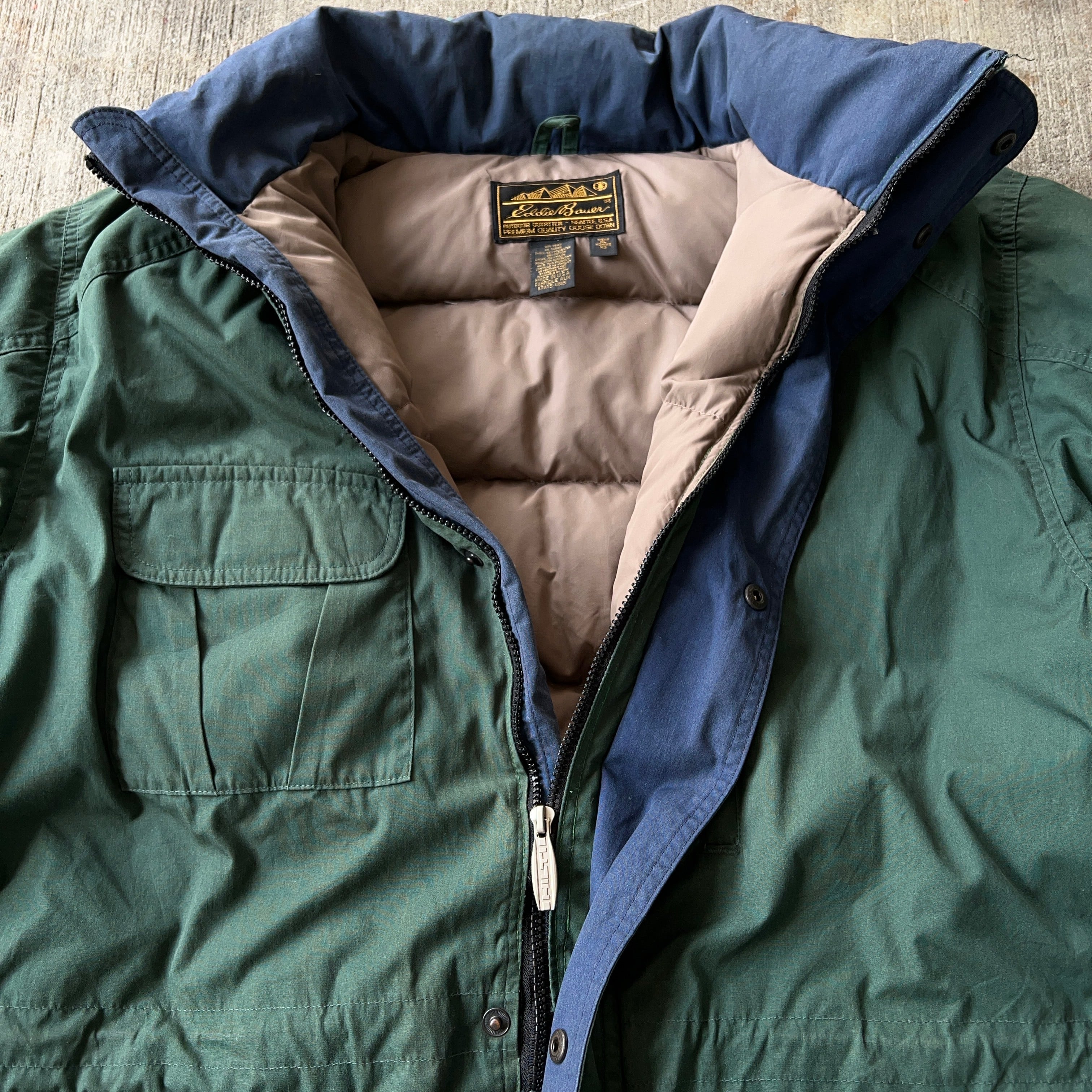 90's Eddie Bauer "PREMIUM QUALITY GOOSE DOWN" Down Jacket 80年代 90年代 エディバウアー プレミアムクオリティグースダウン ダウンジャケット 緑 グリーン 黒タグ【1000A3011】【送料無料】