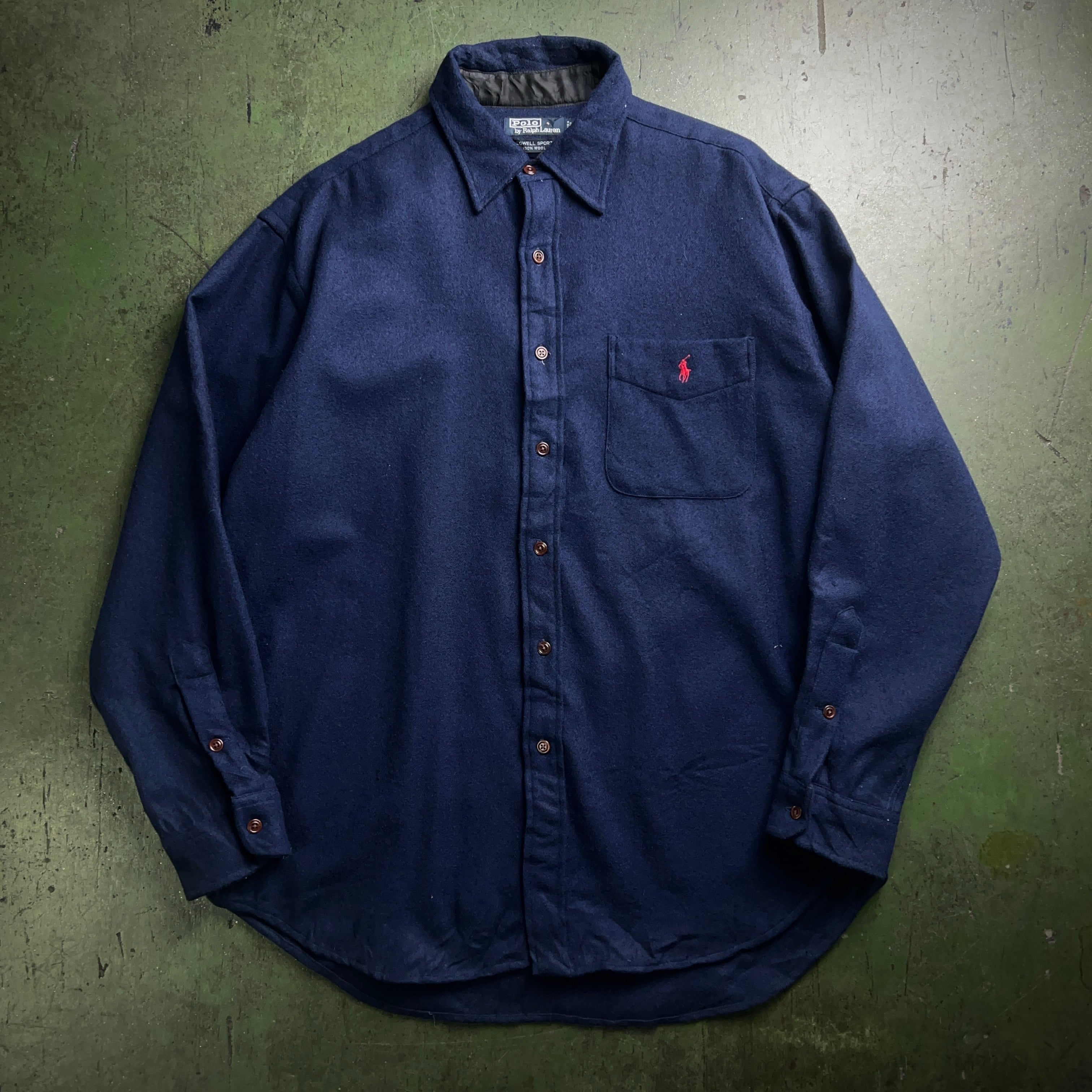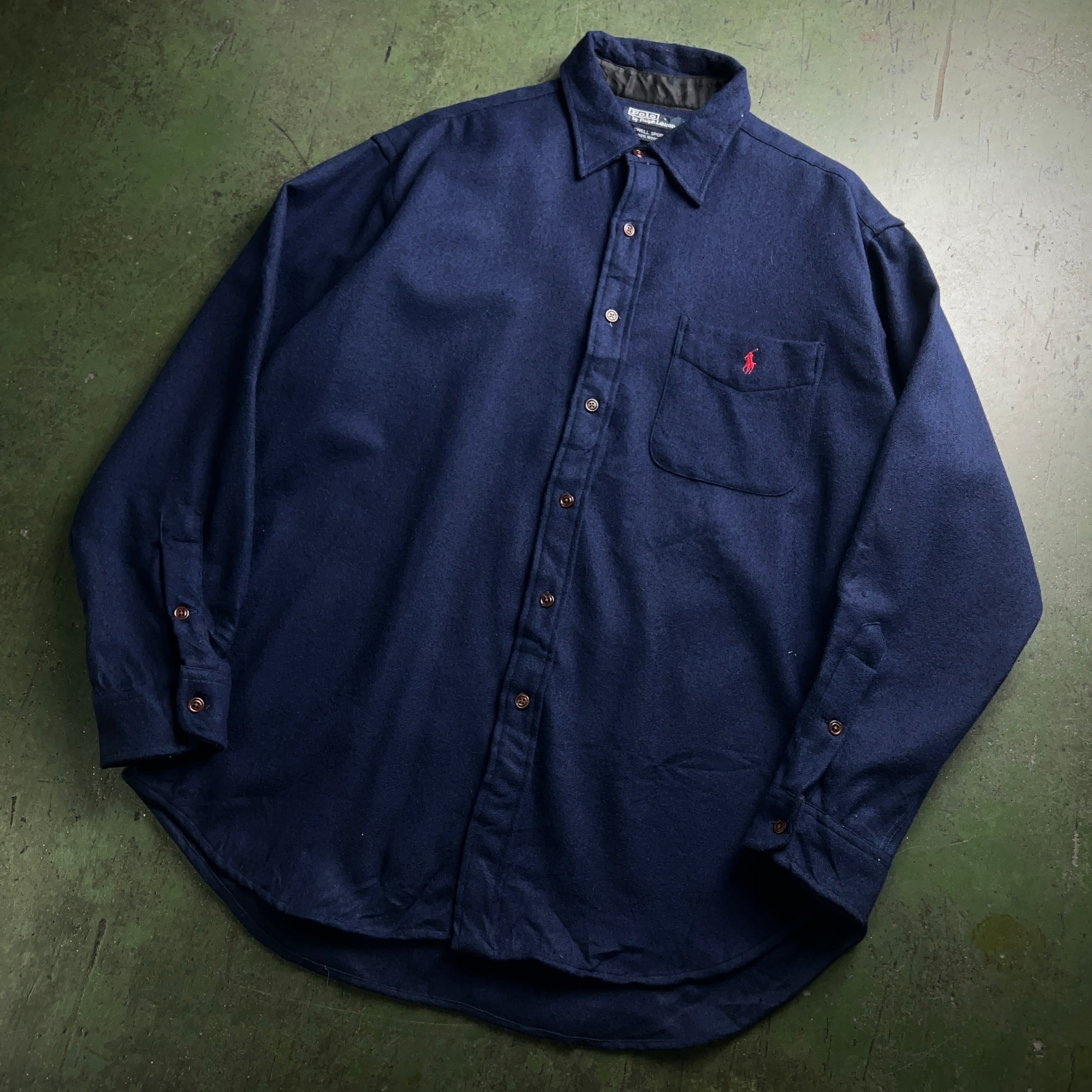 90's Polo by Ralph Lauren "LOWELL SPORT" WOOL SHIRT NAVY 90年代 ポロラルフローレン ウールシャツ 無地 ネイビー 紺 CPOシャツ SIZE L【1000A3022】【送料無料】