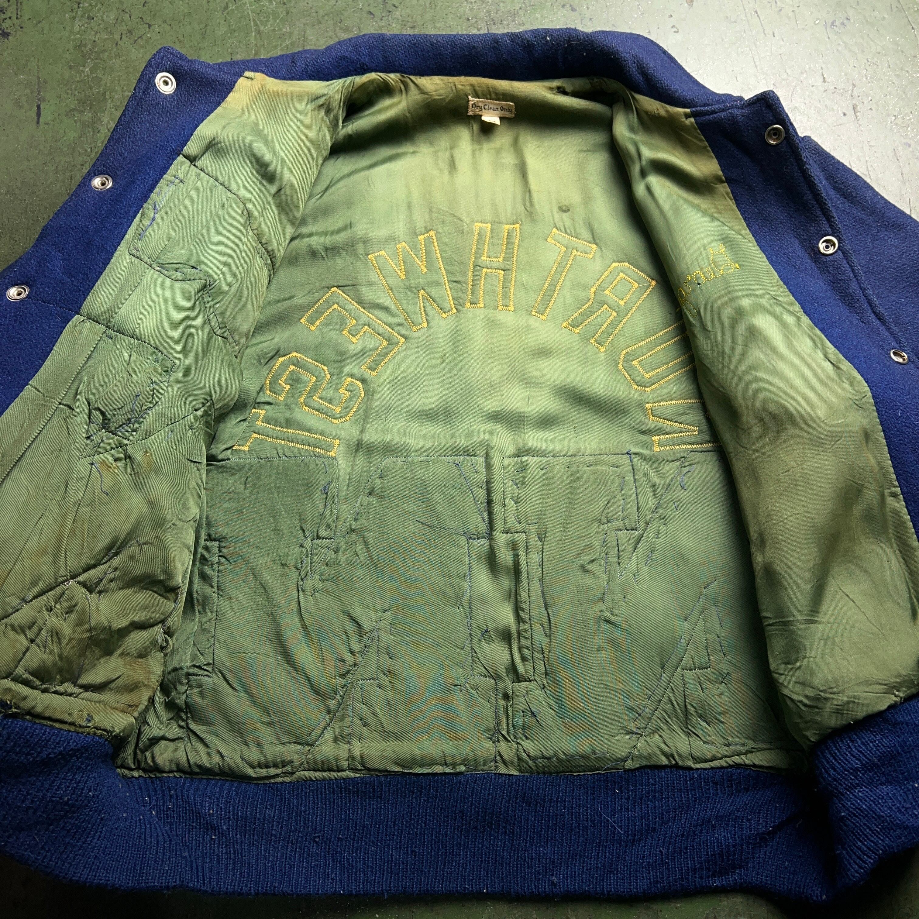 メルトンウールボディにレタードワッペンや刺繍が豪華に取り付けられた1着。